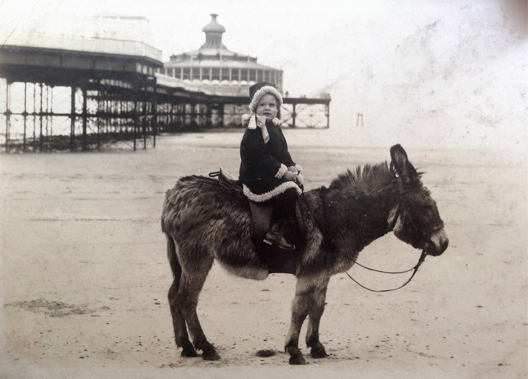 Dochter Doralisa in juni 1923 op het strand van Scheveningen, op de ezel die moeder Jet in een opwelling mee naar huis nam.