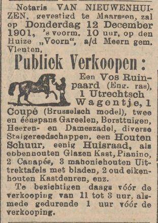 Het gezelschap was op het Huis te Voorn als gast bij het familielid – het was allemaal ergens verwant aan elkaar – Jan Willem Antonie Barchman Wuytiers die in dat jaar als burgemeester de overstap maakte naar Amersfoort. Die carrièreswitch zal niet de reden zijn waarom ze zich zo uitdosten op een ‘boerenrijtuig’ als de sjees. Al van het begin van de 19e eeuw of zelfs eerder was in juni het ringrijden met tweewielige rijtuigen op de Meerensche kermis. Die spelletjes waren populair en er deden vele tientallen stelletjes aan mee. Alleen was dat in juni, hartje zomer dus en de foto is gemaakt in de winter. De bomen zijn kaal en het regent, in de raamopening staat een paraplu. Het antwoord ligt voor de hand: het was ter gelegenheid van het huwelijk van Koningin Wilhelmina en Prins Hendrik op 7 februari 1901, een regenachtige winterdag. We zullen de adellijke jongelui niet tegenkomen in de uitslagen van de spelen die dag, want dat gold toch vooral als ‘volksvermaak’ en daar kon je met goed fatsoen als toekomstig burgervader en lid van de Ridderschap van Utrecht niet aan meedoen: als je zou winnen was het bevoordeeld en als je verloor was het gezichtsverlies.