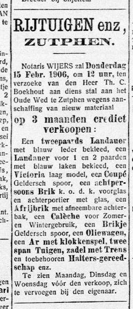 In 1906 laat stalhouder Thomas Coenraad Boekhout (1870-) op dit adres negen rijtuigen en wat tuigage verkopen op krediet om nieuw materiaal aan te kunnen schaffen. Onder de te verkopen rijtuigen is een landauer met blauw leder bekleding, mogelijk het rijtuig van Umbgrove. Boekhout zet dat jaar ook een span halfbloed Hackney vosblessen (‘mak in tuig ook bij spoor en tram’), een voskleurig Hongaarse werkpaard en een coupé van het fabricaat Veth, Arnhem te koop in de krant. Van een totale uitverkoop was geen sprake, wel verandert na 1906 het adres van de Berkelkade naar de Waterstraat 36. In 1920 komt Boekhout nog met paarden op de Landbouwtentoonstelling in Olst en een jaar later vraagt hij vergunning voor de bouw van een paardenstal met wagenloods aan de Houtwal. Hoe het afliep met Boekhout in Zutphen is echter een raadsel.