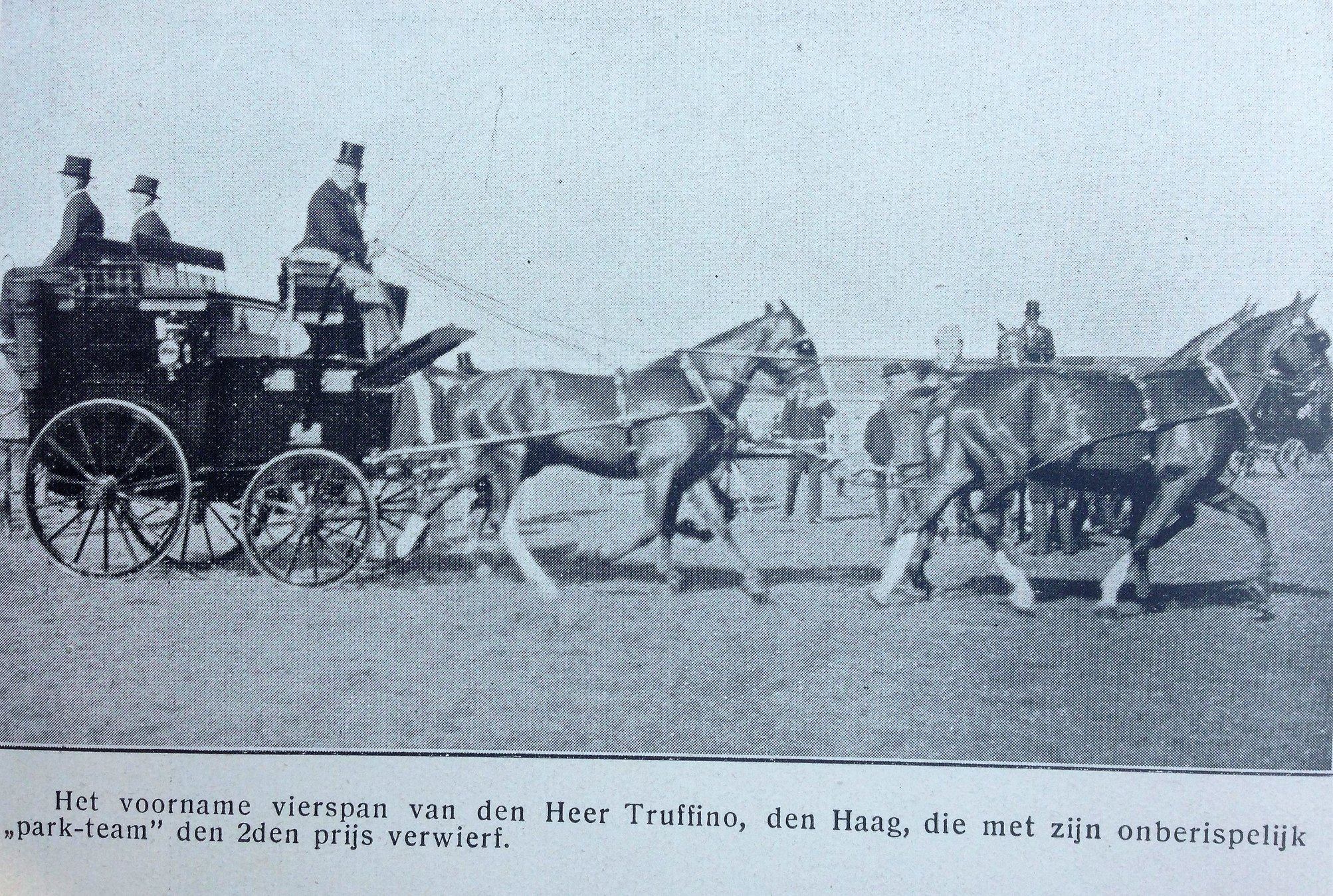 Van 1915 tot 1919 verschijnt ene mijnheer Truffino met veel bombarie op het deftige Concours Hippique in Den Haag. Met zijn vierspan Hackney’s steekt hij als relatieve nieuwkomer gelijk de gevestigde orde naar de kroon. Voor de rijtuigliefhebber opmerkelijk: hij brengt het ‘onberispelijke’ vierspan uit voor een private omnibus, gebouwd door Vanden Plas in Brussel. Het rijtuig komt als twee druppels water overeen met een omnibus die tegenwoordig in het Nationaal Rijtuigmuseum in Leek staat, ware het niet dat deze afkomstig zou zijn van de ‘familie Van Dorssen in Zeist’.