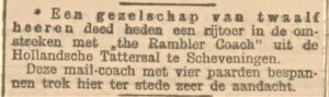 “Als de mailcoach met vierspan van Scheveningen naar Wassenaar rijdt, staat elke voorbijganger een ogenblik te kijken naar het schilderachtigste van alle voertuigen, en zij, wier portemonnee ’t niet toelaat, denken: wat moet ’t heerlijk zijn, zoo’n ritje mee te maken. En dan denken ze meteen even aan Pickwick en Copperfield en Peter Simple, die ons hebben verteld, hoe ze reisden met de postkoets, in den tijd, toen die het vervoermiddel was. Maar de lui, die zich de weelde van zoo’n archaïsch getint toertje kunnen veroorloven, stappen liever in den auto”, sombert de krant Het Vaderland op 4 augustus 1912 over het commercieel succes van die onderneming.