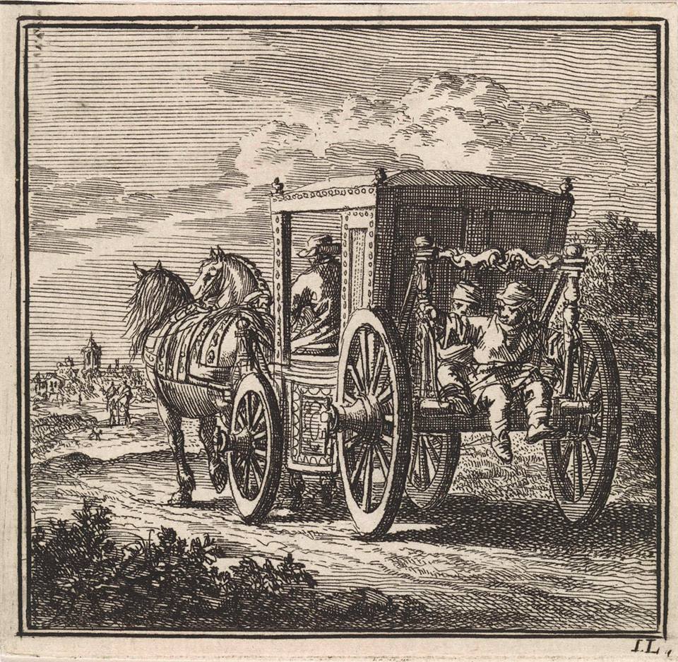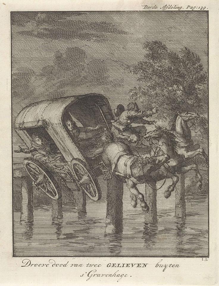 De Amsterdammer Jan Luyken (1649-1712) laat in zijn etsen wel vaker een beeld zien waarbij een koetsenrit het minder goed afloopt, zoals van het dodelijk ongeluk van twee geliefden bij Den Haag. De ets is gemaakt in 1699.