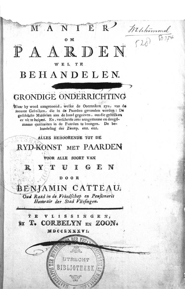 Maar de grote verdienste Benjamin Catteau is dat hij het allereerste Nederlandse ‘lesboek’ voor de koetsier schreef, met de titel ‘Manier om paarden wel te behandelen’ uit 1786, met daarin ‘alles behorende tot de rijkunst met paarden voor alle soort van rijtuigen’. De Leidenaar Le Francq van Berkhey schreef net iets eerder (1769) uitgebreid over het aangespannen rijden in de ‘Natuurlijke Historie van Holland’, maar dat was niet bedoeld voor praktijkonderwijs.