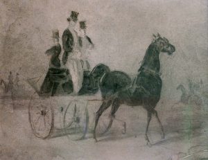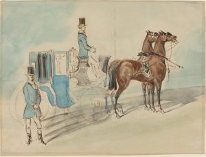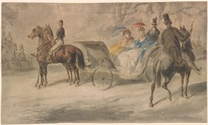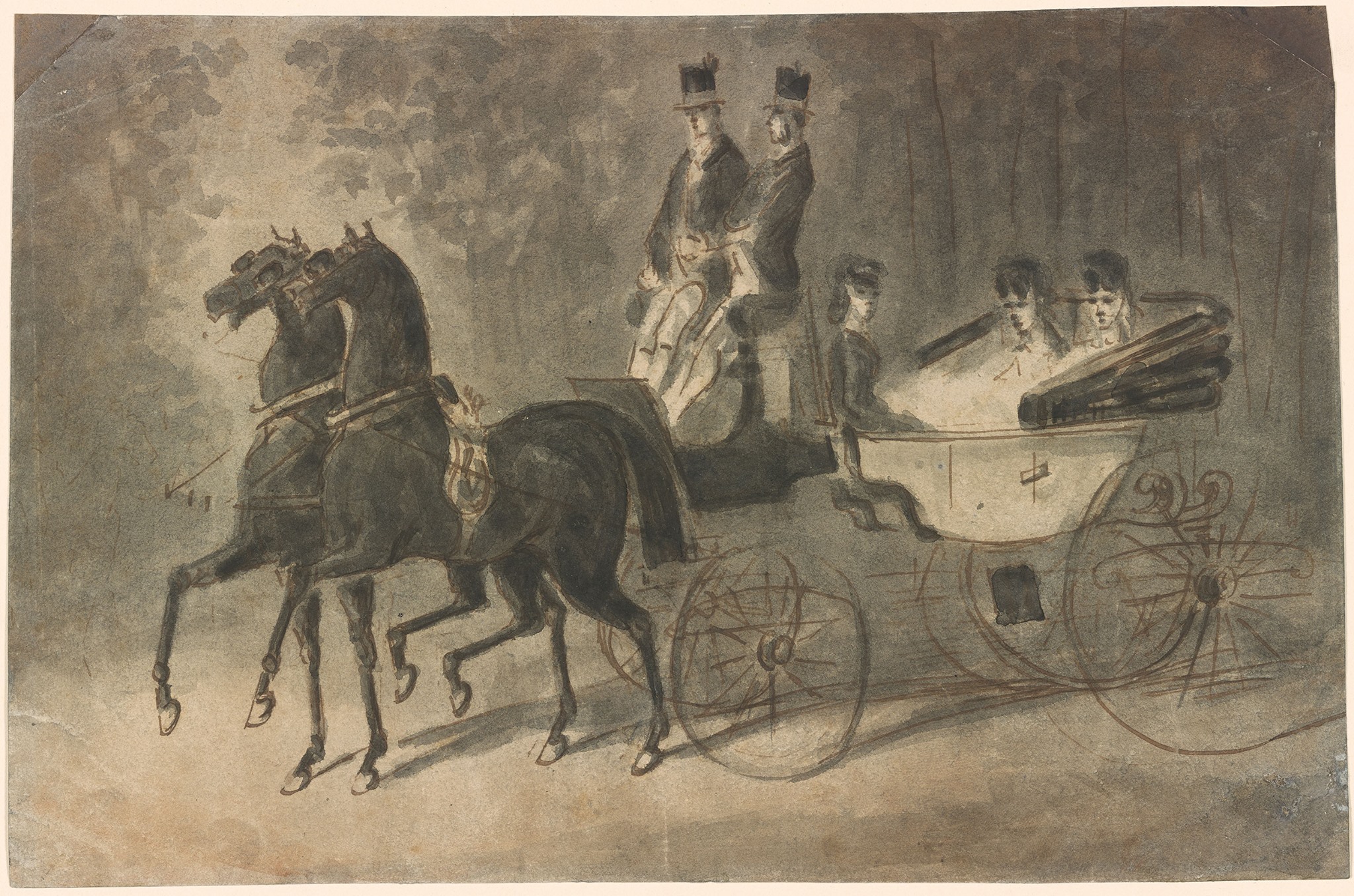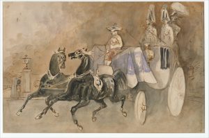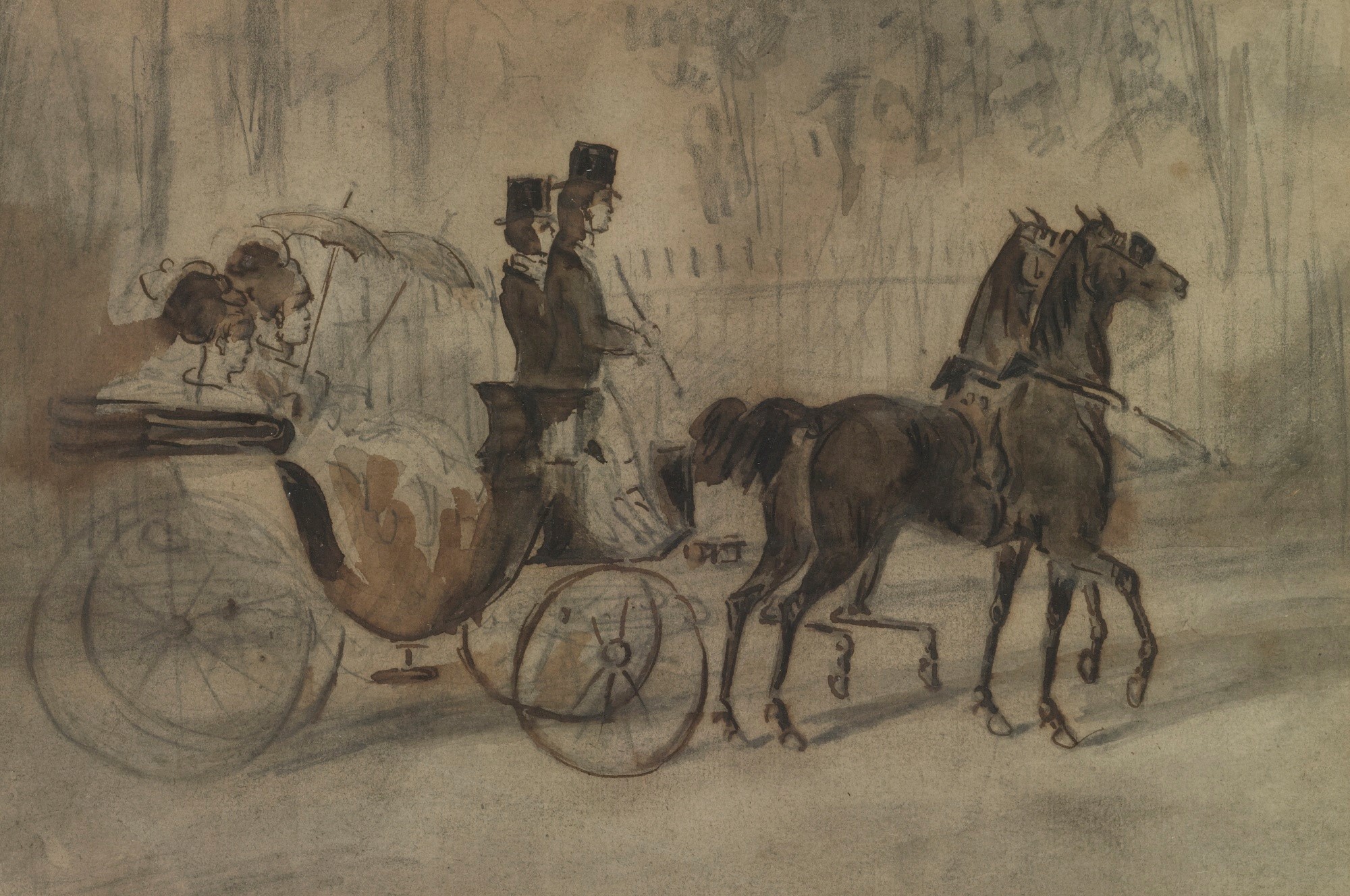 Het Kröller-Müller Museum heeft in haar collectie een vrij donkere aquarel met als titel ‘De Rijtoer’ uit 1865, door Constantin Guys.