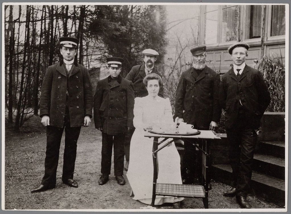 Ruim een eeuw geleden kon een burgervader zich nog wel wat personeel veroorloven, blijkt uit de foto van het personeel van Huize Overbosch, dat overigens is verwoest op 12-13 mei 1940. Van links naar rechts: koetsier Van Buren, Dirk Verbeek, onbekende, de tuinman Dirk Romeyn en Willem Vermeer. Voor de heren heeft Cornelia Gijsbertha van Essen plaatsgenomen en ongetwijfeld leidde zij het huishouden. (bron Historische Vereniging Oud-Renswoude)
