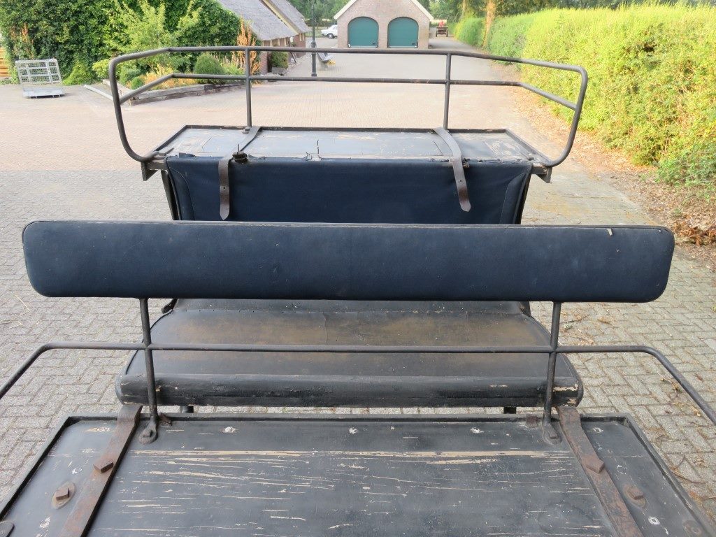 De jachtbreak is gebouwd door Mühlbacher in Parijs, aan het einde van de 19de eeuw de oudste rijtuigfabrikant van Parijs en toonaangevende voor de gehele wereld. Deze break is niet de enige die daar is gemaakt, het was een standaardmodel dat de rijke clientèle naar wens kon laten aanpassen. Zo wilde de familie Van Zuylen van Nijevelt er een extra verhoogde knechtenbank achterop en een voetrem, waarvan het pedaal is op te klappen. “Toch vraag je je ieder keer af, wat is origineel en hoe is het tot stand gekomen”, vraagt Maria Stolk terwijl ze twijfelt aan de voetrem aan de hand van stiksels in een valletje. Ze bekijkt het als een ware rechercheur. Crime Scene Investigation in Balkbrug. “Het kan ook best zo zijn dat er een standaardbekleding is gemaakt en dit later, nog in de fabriek, is aangepast. En kijk naar de knechtenbank, als de wagen vol zit hangt hij behoorlijk door zijn veren, klopt dat dan?” Het zijn de eeuwige twijfels die een groot deel van haar tijd opslokken. Toch kan ze niet anders dan constateren. Om te bepalen welke kussens er op horen zijn er oude foto’s, waarop zachte kussens zijn te zien. “Maar die wippen wat op, dat kan toch niet zo door een kwaliteitsbouwer zijn afgeleverd? Vandaar dat we al aan houten frames waren begonnen, maar dat blijkt toch niet origineel te zijn.” Wereldwijd zijn er nog een stuk of zeven van deze jachtbreaks van Mühlbacher bewaard gebleven. In Argentinië, Frankrijk en Nederland. Eentje in België lijkt zijn originele kussens nog te hebben. Van geweven laken. Mogelijk kan dit model staan voor de bekleding van de break van De Haar. Projectleider Claas Conijn gaat die knoop in de komende tijd doorhakken. Hij legt nog even uit, waarom het zo belangrijk is dat kasteel De Haar zo moeite doet voor drie notabene Franse rijtuigen. “Er is, op het Koninklijk Staldepartement na, vrijwel geen kasteel of buitenplaats meer waar zo’n imposante collectie rijtuigen bij elkaar is gebleven en zeker niet in deze kwaliteit.” Het is een monumentaal ensemble. En met ‘kwaliteit’ doelt Conijn niet alleen op de naam van de fabrikant, vooral ook op het feit dat de rijtuigen nog in oude staat zijn. “Zelfs al bladdert de verf er af en zijn die zitkussens verdwenen, dat we de oude verflagen en stoffen nog hebben is erg waardevol, daarmee kunnen we die materialen en technieken ook aan volgende generaties doorgeven.” En alleen al daarom kiest Maria Stolk niet voor een paar willekeurige kussens en een leuk lapje stof van de markt.