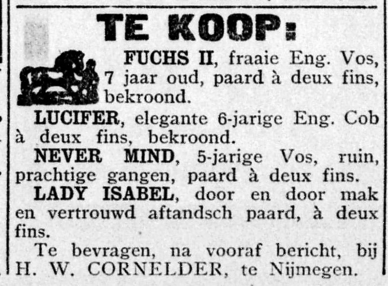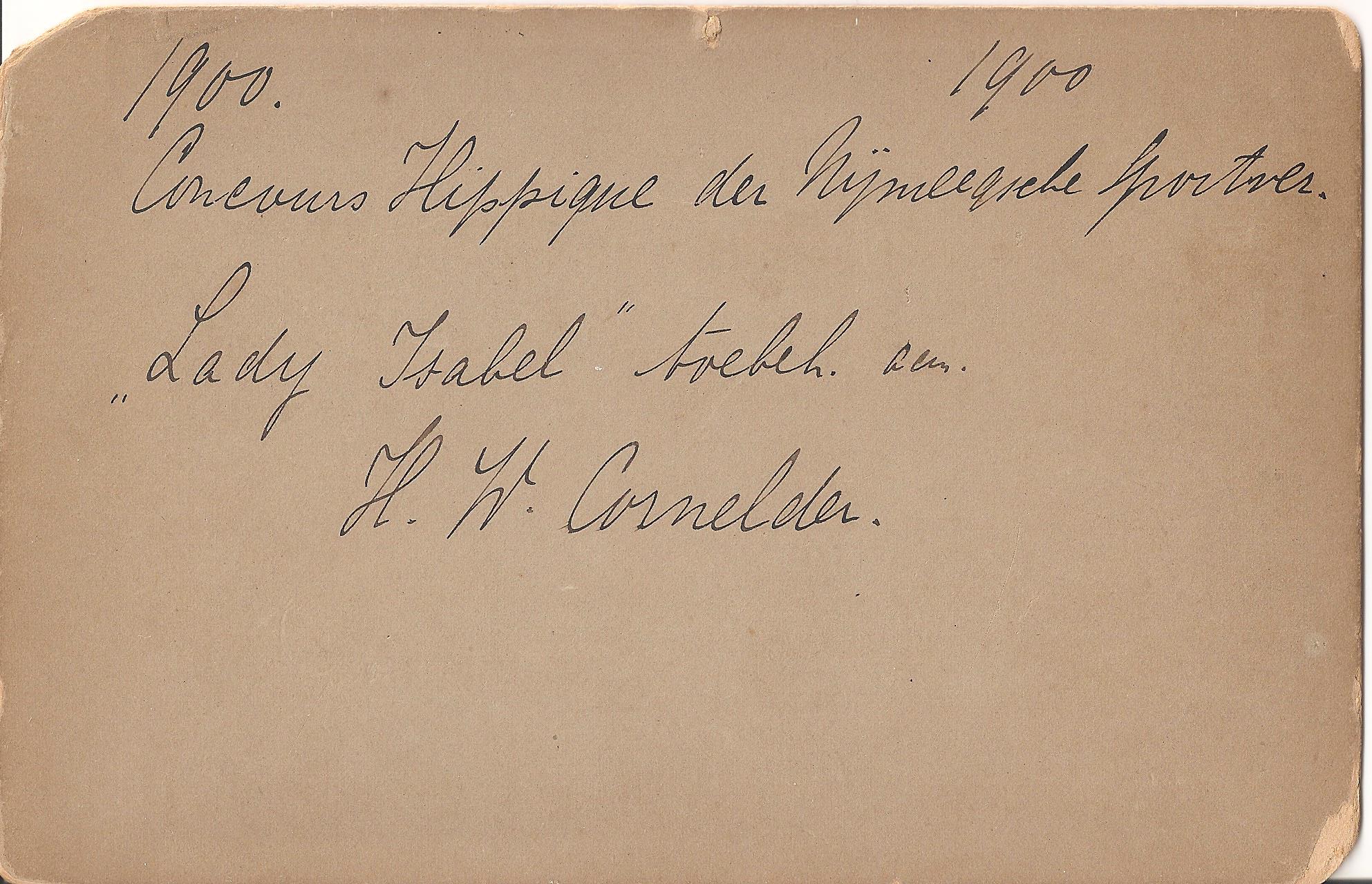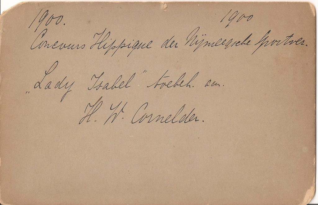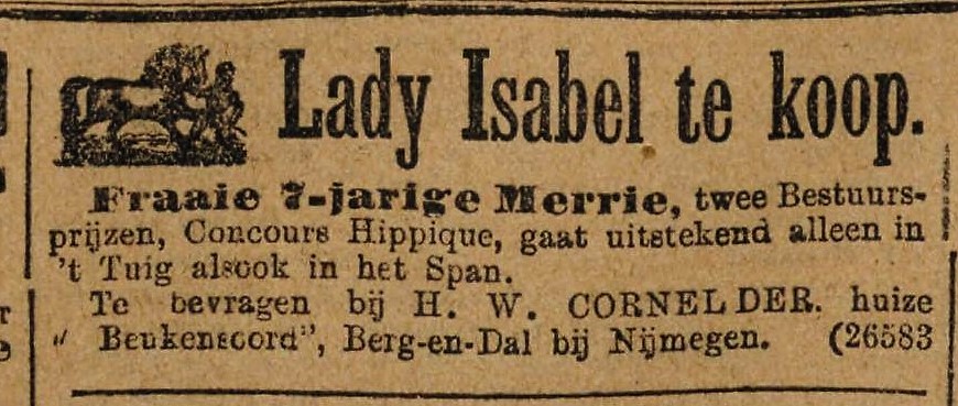 In 1901 zet hij Lady Isabel te koop in het Algemeen Handelsblad. Maar blijkbaar heeft Cornelder een dusdanig bedrag voor zijn topper in gedachten, dat Lady Isabel zes jaar later nog steeds of wederom te koop staat, ditmaal als ‘vertrouwd aftandsch’. Ze is dan dertien jaar…..
