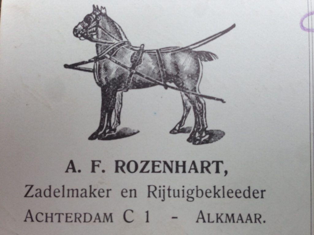 De Achterdam in Alkmaar is vooral bekend van de rode lichtjes, van de dames van plezier dus. Maar dat is vooral van na de periode van Rozenhart, tuigenmakerij sedert 1794. In vroegere jaren zal er geen Alkmaarse boer zijn geweest, of hij had hoofdstellen, leidsels of een gareel aan de Achterdam nr.1 laten maken bij van Rozenhart. Het opgezette paard in de etalage, met de nijver werkende Arend Rozenhart op de achtergrond is voor velen nog altijd een levende herinnering.
