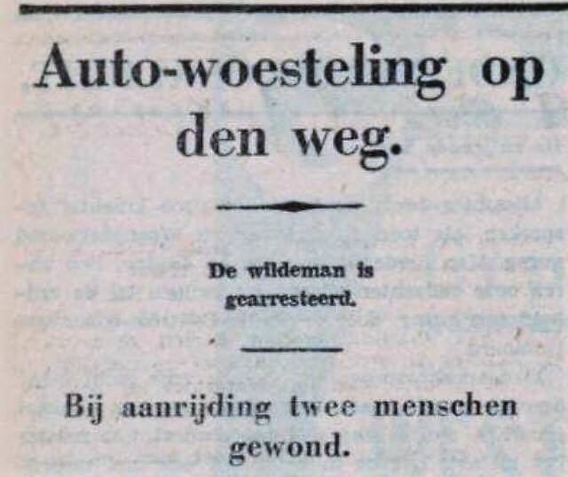 “Nijmegen – Woensdagavond is op den Graafschen weg een ernstig ongeluk gebeurd. De slager G. keerde per tilbury met zijn 64-jarigen schoonvader S. stadwaarts. Toen een automobiel in vliegende vaart passeerde, werd het paard schichtig en sloeg op hol. S. had inmiddels het voertuig verlaten, en trachtte het paard tot staan te brengen. Hij slaagde hierin evenwel niet, doch werd een eind medegesleept en kwam toen te vallen. Paard en rijtuig gingen over zijn lichaam. Het paard holde met het rijtuig door, tot het voertuig ten slotte tegen een boom slingerde. De slager G. sloeg toen uit de tilbury, en bekwam daardoor eenige kneuzingen. S. daarentegen werd in treurigen toestand bewusteloos opgenomen. De bestuurder van den automobiel had zich intusschen met razende snelheid verwijderd, zonder zich van de zaak iets aan te trekken.” (De Grondwet 02-07-1902)