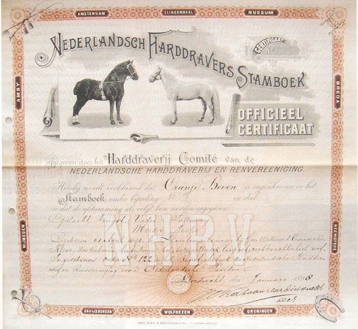 Het stamboekbewijs van de hengst Oranje Boven met daarop foto’s van de Hackney-hengst Pullaway (links) en de Orloff-schimmel Tabor II. Zij waren de beste draverdekhengsten van hun tijd.