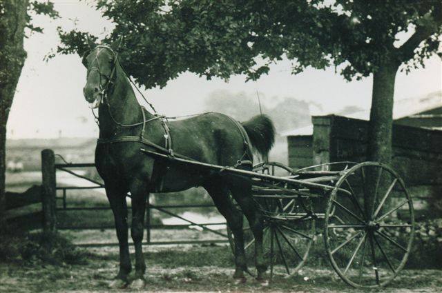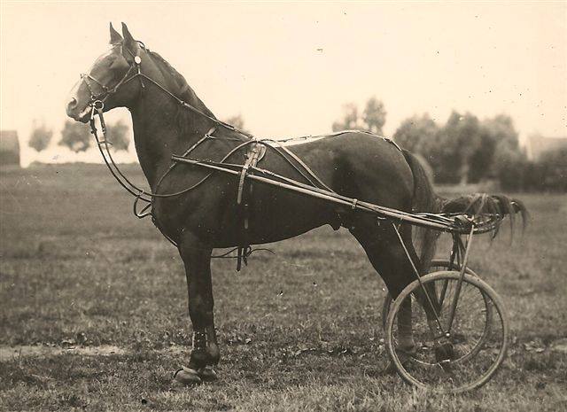 Stepaway in 1885 geboren op de Cruquius-hoeve, een bruine merrie van Pullaway uit een inlandsche merrie. Aan de Amerikaanse sulky met de houten wielen kun je zien dat de foto is genomen vóór ca. 1890. Daarna ging men op de drafbaan luchtbandjes gebruiken.
