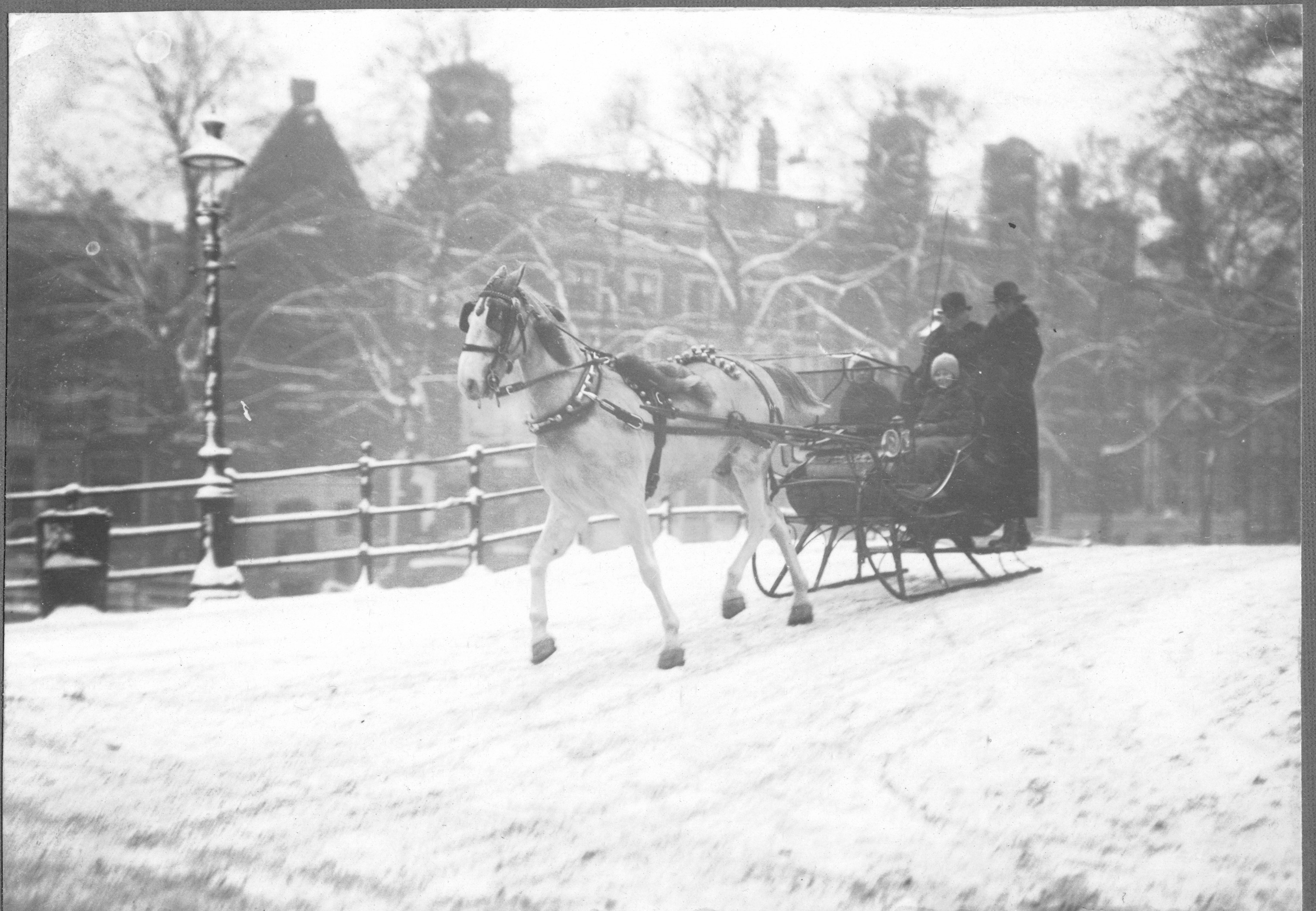 Vooralsnog blijft het kwik deze week boven het vriespunt hangen. Maar wie weet. De winter kan nog toeslaan, net als op deze foto uit de jaren twintig op de kruising van de Keizersgracht en de Reguliersgracht in Amsterdam. Jonkheer Hendrik van Loon en koetsier Verbaarschot staan achterop de slee, met daarin de jonge Freules Yvonne en Machteld van Loon.