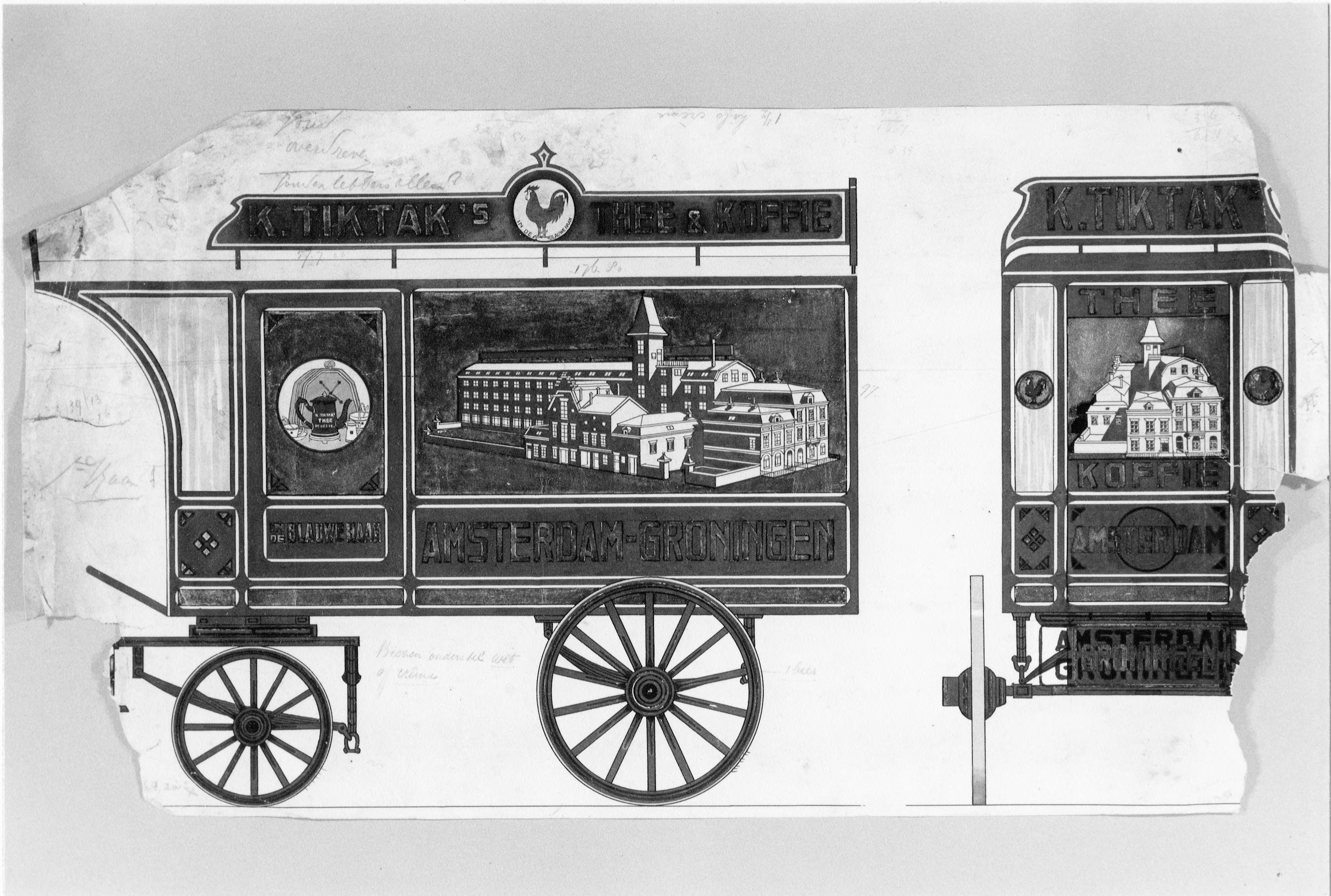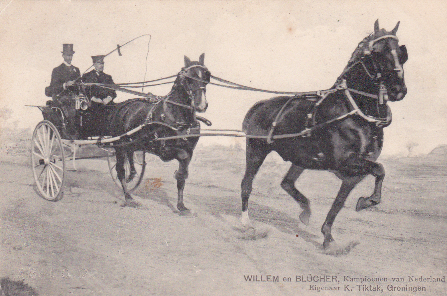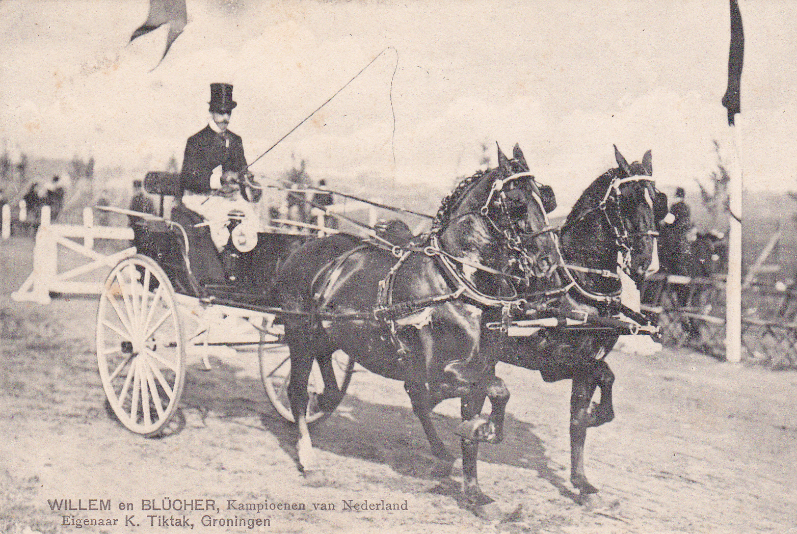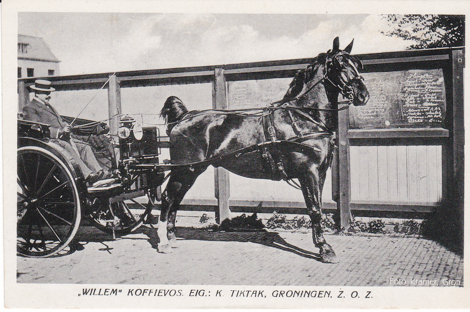 Willem en zijn spangenootje Blücher stalen niet alleen de show op het concoursveld. Als driejarigen liepen ze al in 1905 voor de gele bestelwagen van de firma. Voor een optocht: “De Jury had nog een prijs van ƒ 10 toegekend aan K. Tiktak te Groningen voor zijn versierden koffiewagen, omdat deze, hoewel zich weinig leenende voor versiering, vooral wat die der paarden betreft, in den stoet een gunstigen indruk maakte.” Met dat werk voor de bestelwagen gaan ze hun hele carrière bij Tiktak door. De Nieuwe Veendammer Courant schreef nog in 1911: “Bedenkt men dat deze zeldzaam mooi bij elkaar komende paarden reeds eenige jaren in Groningen dienst doen voor den koffiewagen, en dan nu nog zoo verbazend veel kunnen presteren, dan is verdere beschrijving over de hooge kwaliteit van dit tweetal natuurlijk geheel overbodig. Dat vele paardenliefhebbers wel eens, ter wille van ’t ensemble Willem-Blücher, een extra kopje Tiktak’s koffie drinken, is hun zeker niet zoo heel kwalijk te nemen!”