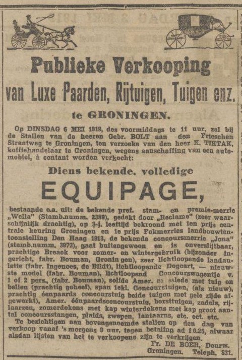 Klaas Tiktak schaft een automobiel aan en verkoopt daarom op 6 mei 1919 zijn ‘volledige equipage’