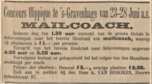Abraham van Hoboken uit Scheveningen boekte met 51 minuten de tweede plaats. “Het vierspan van Van Hoboken maakte in handen van zijn eigenaar een bijzonder gunstige indruk; het geheel was uit sportief oogpunt wel het beste wat er bij was. De paarden kwamen wonderwel bij elkaar. Jammer dat de vandehandse-achter geen roodschimmel was.” Van Hoboken maakte van de gelegenheid gebruik om de coach vol te laden met betalende passagiers, waar hij voor reclame voor had gemaakt: ieder dag van het concours reed zijn koetsier langs de grote hotels van Scheveningen naar het terrein Houtrust, een ritje waar de passagiers een gulden voor betaalden. Twaalf passagiers konden er maximaal mee. De marathon met Van Hoboken zelf aan de leidsels meemaken, kostte een rijksdaalder, de ereplaats gelijk naast de rijder (’the boxseat’) vijf gulden.