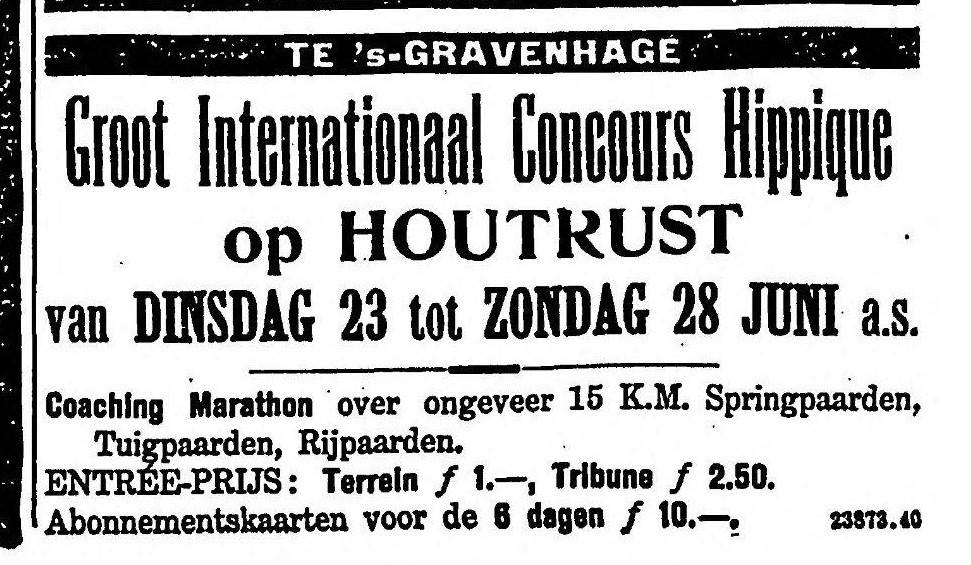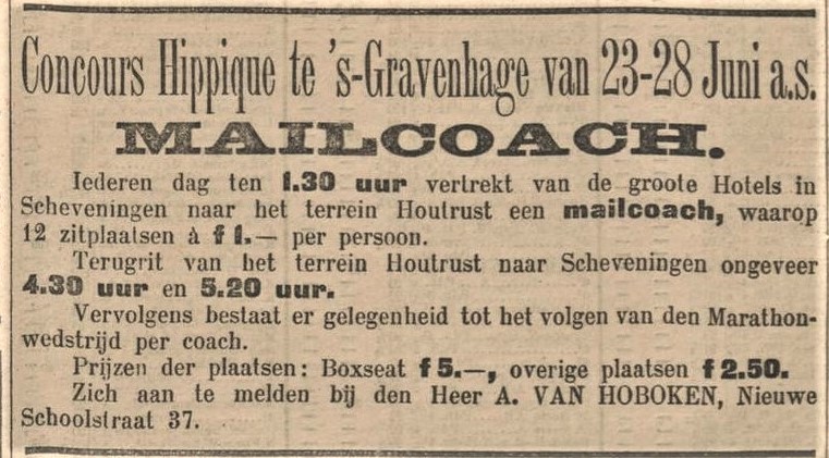 De grote show in Londen bracht de organisatie van het jaarlijkse Concours Hippique op Houtrust, Den Haag, op het briljante idee om een paar jaar later ook een marathon te laten verrijden. Die allereerste marathon in Nederland was op woensdag 24 juni 1914. De zeven deelnemers reden met hun coaches een rit van 15 kilometer, waarbij ze binnen één uur terug moesten zijn op Houtrust. Bij tijdsoverschrijding, tenzij het niet zijn schuld was, viel een rijder buiten de klassering. Ook op galopperen stond de straf van diskwalificatie. Inhalen mocht, in draf en zonder elkaar te hinderen. Duurde het inhalen langer dan twee minuten, dan moest de achtervolger zijn inhaalpoging staken. “Geen rijtuig, paard, automobiel of wat dan ook zal naast, voor of achter de coach als hulp of pacemaker mogen meerijden”, aldus het reglement. De deelnemers vertrokken met tussenpozen van drie minuten. De Nieuwe Rotterdamsche Courant (25-6-1914) spreekt over ‘heel veel kijkers’ langs de weg. “Bij het Kurhaus en het Palace Hotel stonden zo veel menschen dat het wel leek of de Koningin werd verwacht.”