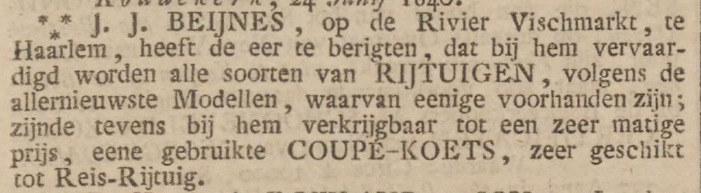 Hoe de verhouding van de familie Beijnes-Staal ten opzichte van Soeders verder is, weten we niet. Maar de jonge Beijnes woont in den zomer van 1838 in het huis naast de verkochte fabriek en geeft in een officieel stuk ‘zaakwaarnemer’ op als beroep. Dat wekt de indruk dat Beijnes de fabriek in De Bilt leidt voor Soeders, die in Maarssen woont en daar de oudere fabriek beheert. Hoe het ook zij: nog in hetzelfde jaar vinden we het jonge paar terug in Haarlem. In de notulen van de vergadering van B&W aldaar in oktober 1838 is sprake van een verzoek van J. Beijnes, wagenmaker aan De Bilt en eigenaar van de kaarsenmakerij aan de Riviervischmarkt, huidige nummer 7. Hij wil het pakhuis van de kaarsenmakerij verbouwen tot een wagenmakerij en daarbij twee naar buiten openslaande deuren plaatsen. Dit verzoek schijnt in eerste instantie te zijn afgewezen, maar wordt een maand later toch ingewilligd. In augustus 1839 doet Beijnes als ‘wagen- en rijtuigmaker op de rivier vischmarkt’ een nieuw verzoek, ditmaal met ”met verschuldigde gevoelens te kennen gevend, dat hij ter verdere uitbreiding zijner affaire het voorhuis van het door hem bewoond wordende huis, naast zijne werkplaats, wilde inrichten tot eene bewaarplaats voor gemaakte rijtuigen.” Ook in dat pand wil hij naar buiten draaiende deuren. Het is de eerste uitbreiding van de prille, en zeer levensvatbare onderneming.