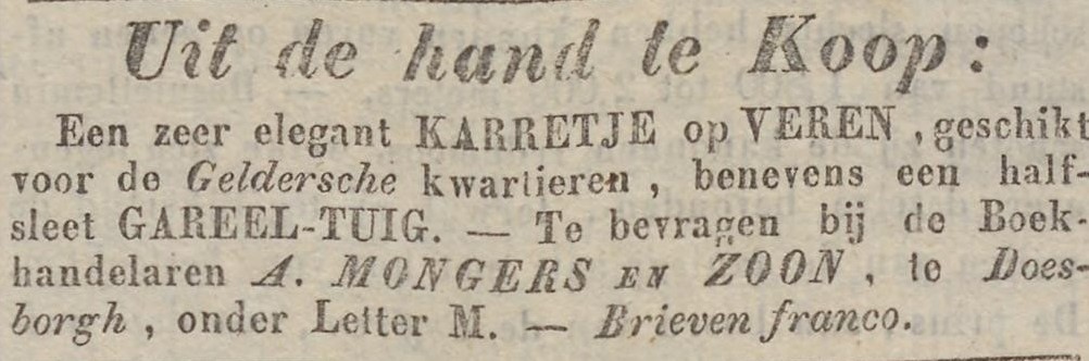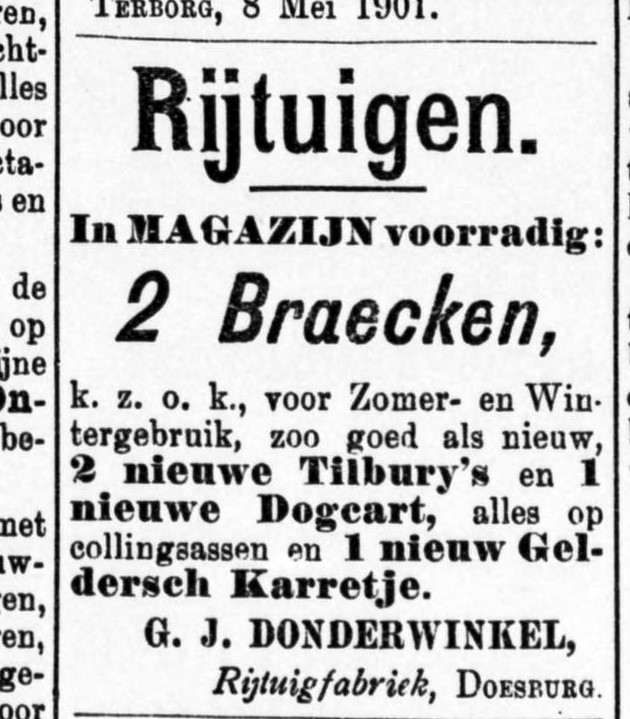 Als in oktober 1844 een advertentie in de Arnhemsche Courant verschijnt ‘Uit de hand te koop, een zeer elegant karretje op veren, geschikt voor de Geldersche kwartieren’, is dat in dezelfde periode dat de boerenzoon Gerrit Jan Donderwinkel (1817-1901) trouwt met Hendrika Isabelle Himpe en zich vestigt als wagenmaker in Doesburg. Hij kan zo’n karretje maken. Het ‘Geldersche karretje’ is een begrip ook buiten de provincie en bij andere rijtuigfabrikanten. Medio de jaren 1860 biedt Gerrit Jan naast andere rijtuigen altijd wel ‘karretjes op veren’ aan en later verandert dat in ‘Geldersche en Steegsche karretjes’, al dan niet aangeduid als kapkarretjes. Het is, in tegenstelling tot de kapkarren in andere provincies, vrijwel altijd als verkleinwoord, zelfs al gaat het ook in het Gelderse om een tamelijk robuuste kar met twee banken achter elkaar. De kap is facultatief. Uitgaande van advertenties en de kapkarren die nog resteren is Donderwinkel zonder twijfel de belangrijkste bouwer van dit type geweest.