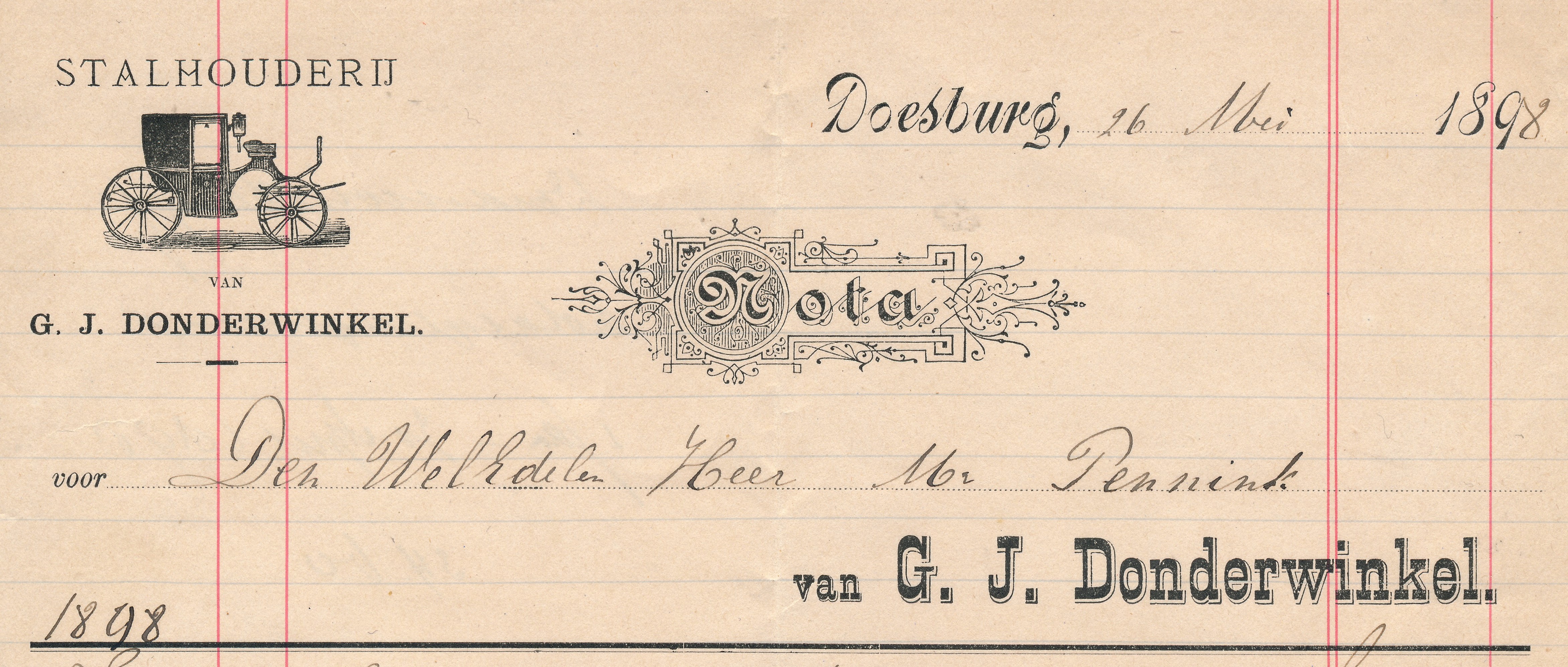 Een nieuwe impuls komt als zoon Gerrit Jan Donderwinkel (1855-1933) in 1880 trouwt met Arnolda, de dochter van stalhouder Gerrit Jan Vossers. Wie de geschiedenis van Vossers als stalhouders aan de Zandbergstraat uitpluist komt vooral drama tegen: van verkopingen, valse beschuldigingen, een te vroeg gestorven zoon en concurrerende schoonzoon. Op 26 maart 1887 verschijnt bijvoorbeeld in twee kranten een verkoping aangekondigd in detail en met notaris ‘wegens afschaffing’ van de stalhouderij van Gerrit Jan Vossers. Of de verkoping gaat niet door en Vossers heeft spijt of de advertentie is vals, maar korte tijd later, in De Graafschap Bode van 16 april, doet Vossers een oproep, waarin hij ten stelligste ontkent te stoppen “en niet zoals reeds door een concurrent verspreide circulaire luidt, opgehouden heeft te bestaan.” Maar zeker is dat Donderwinkel zich met de rijtuigverhuur bemoeit, getuige een rekening uit mei 1898. Meer is er niet over deze Donderwinkel als ‘gelegenheidsstalhouder’, wel dat hij vanaf 1890 fanatiek is als scherpschutter op schietwedstrijden.