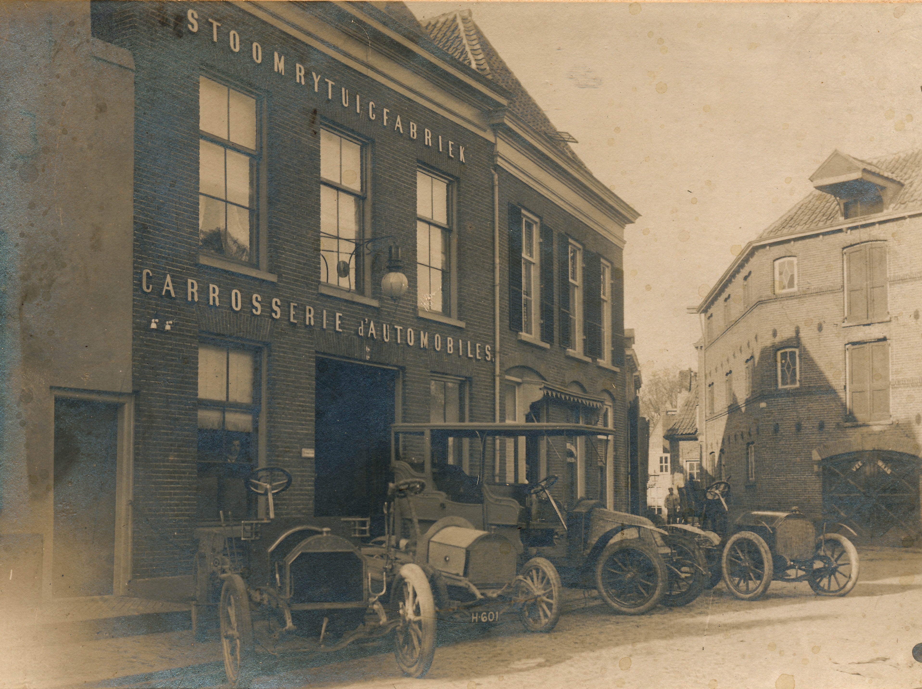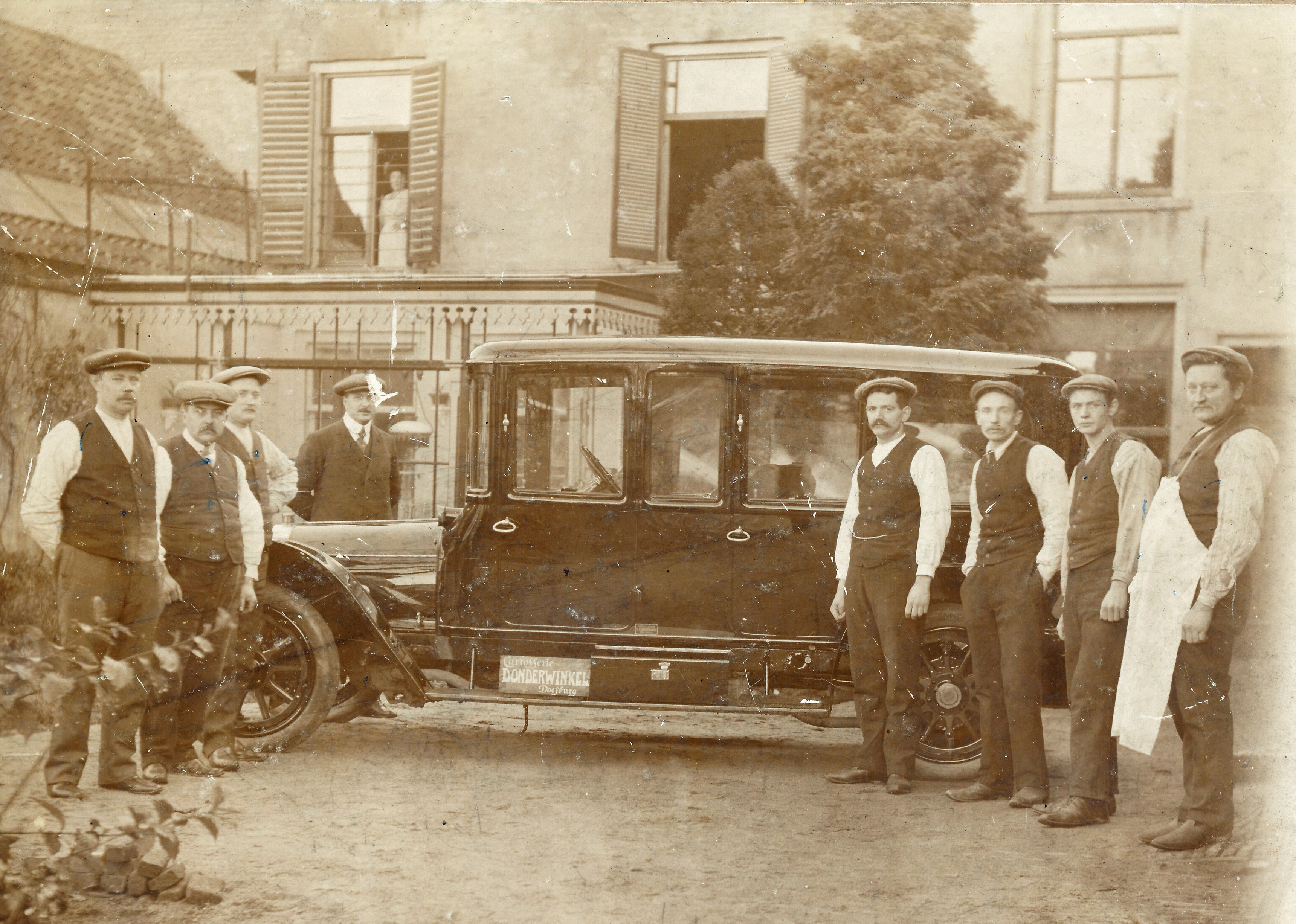 Het rijtuig heeft na de eeuwwisseling plaatsgemaakt voor het automobiel en daarmee komt de derde Gerrit Jan Donderwinkel (1883-1960), getrouwd met Isaäca Johanna Huibers, in beeld. De auto brengt hem niet alleen voorspoed, als hij in april 1934 een zwaar ongeluk krijgt. De chauffeur, waarvan hij als passagier een lift krijgt, moet op de Dierense dijk uitwijken voor een bus en het automobiel klapt tegen de bomen langs de weg. Gerrit Jan wordt uit de wagen geslingerd. Het loopt nog relatief goed met af met de nodige kneuzingen. Veel beter gaat het met de carrosseriebouw. De familie Donderwinkel heeft een eeuw later niet veel tastbaars bewaard of verhalen te vertellen over van de gloriedagen, maar als we de foto’s bekijken heeft Donderwinkel een breed scala aan de meest luxueuze koetswerken gebouwd en dat met motoren of chassis van befaamde merken: Berliet, Darracq, Hudson, General Motors, Renault, Spijker. In 1906 is het bedrijf tamelijk laat gemoderniseerd als ‘stoomrijtuigfabriek’, maar twee jaar later gooit Donderwinkel hoge ogen met de opbouw van een Royal Star en een Opel op de automobieltentoonstelling in het Paleis voor Volksvlijt. Dan gaat het snel: in 1909 gaat het elektrisch, waarmee ook de Philips gloeilampen hun intrede in de werkplaats doen.