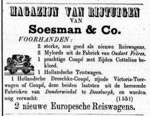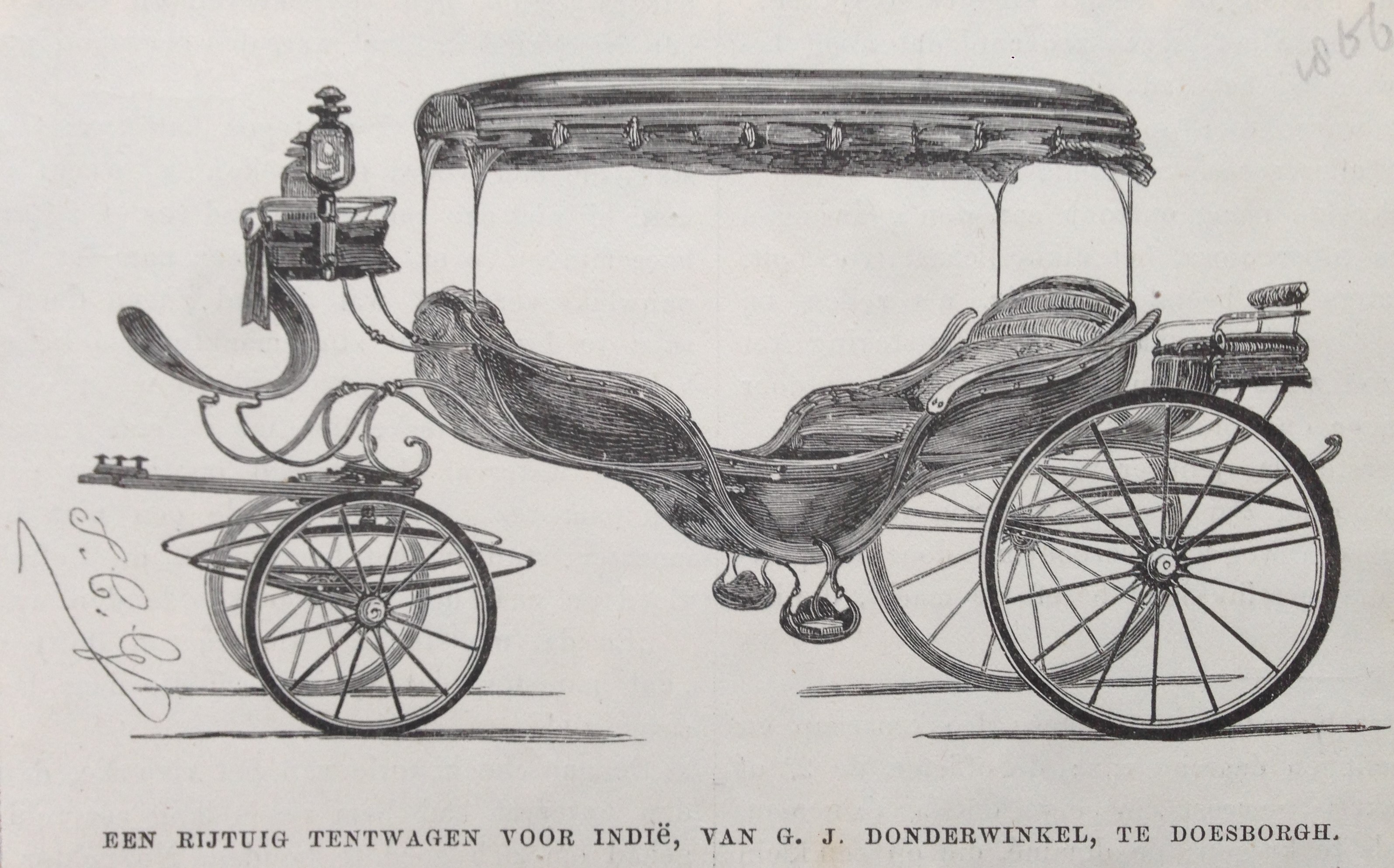 Een andere ontwikkeling is behoefte aan rijtuigen in Nederlands Indië, waar menig Nederlandse fabrikant een graantje van mee wil pikken. In het Samarangsch advertentieblad van 9 november 1860 biedt Soesman & Co een tentwagen en een coupé aan uit ‘de beroemde fabrieken’ van Donderwinkel. Vier jaar later biedt veilinghuis Thooft & Co op Semarang een coupé, een mylord en een tentwagen aan van Donderwinkel. Maar Soesman blijft evenwel nog jaren de vaste vertegenwoordiger van Donderwinkel en telkens zijn het de tentwagens die blijkbaar in de koloniale smaak vallen. Minstens een paar per jaar ‘geverfd en ongeverfd’ gaan de wereld rond. In Amsterdam is Donderwinkel in 1866 present op een grote tentoonstelling voor nijverheid en handel, met een ‘voor Indiën bestemde’ tentwagen en een plaatje laat zien wat voor type dat is: geen boerenkar, maar een luxe vierwielig rijtuig met een koetsiersbok, ruimte voor vier passagiers vis-à-vis en een zomerkap. Het is zo gespecialiseerd dat Soesman na een jaar of tien zelfs advertenties plaatst voor Donderwinkel als ‘tentwagenfabriek’, in De Locomotief, de andere krant van Semarang. Hij noemt deze tentwagens ‘enorm sterk en licht gebouwd, en zeer geschikt voor de heeren fabriekanten.’ De opmerking ‘pas gelost’ geeft aan dat de rijtuigen in zijn geheel aankwamen en niet als bouwpakket om ter plekke te assembleren. Eind 1868 doet de Staatscourant verslag van de toestand van de Nederlandse nijverheid en stelt: “In de rijtuigfabriek te Doesborgh werden 14 verschillende nieuwe rijtuigen afgeleverd , waarvan drie naar Java zijn verzonden. Behalve de patentassen en hetgeen tot het garneren en bekleeden noodig is, wordt al het vereischte in de fabriek zelve vervaardigd.” Naast Soesman leveren de gebroeders Salomonson vanaf 1878 ‘americaines’ en handwagens uit de fabriek van Donderwinkel.