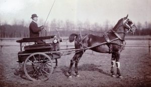 De koetsier van Stal Doorwerth, Hendrikus Johannes Snippe (1858-1909), met een dresseerkar tijdens de africhting. De koetsier zit op een apart zitje recht achter het paard en de leidsels lopen vrij boven de kont van het paard, dankzij de leidselsgeleider op de bomen.
