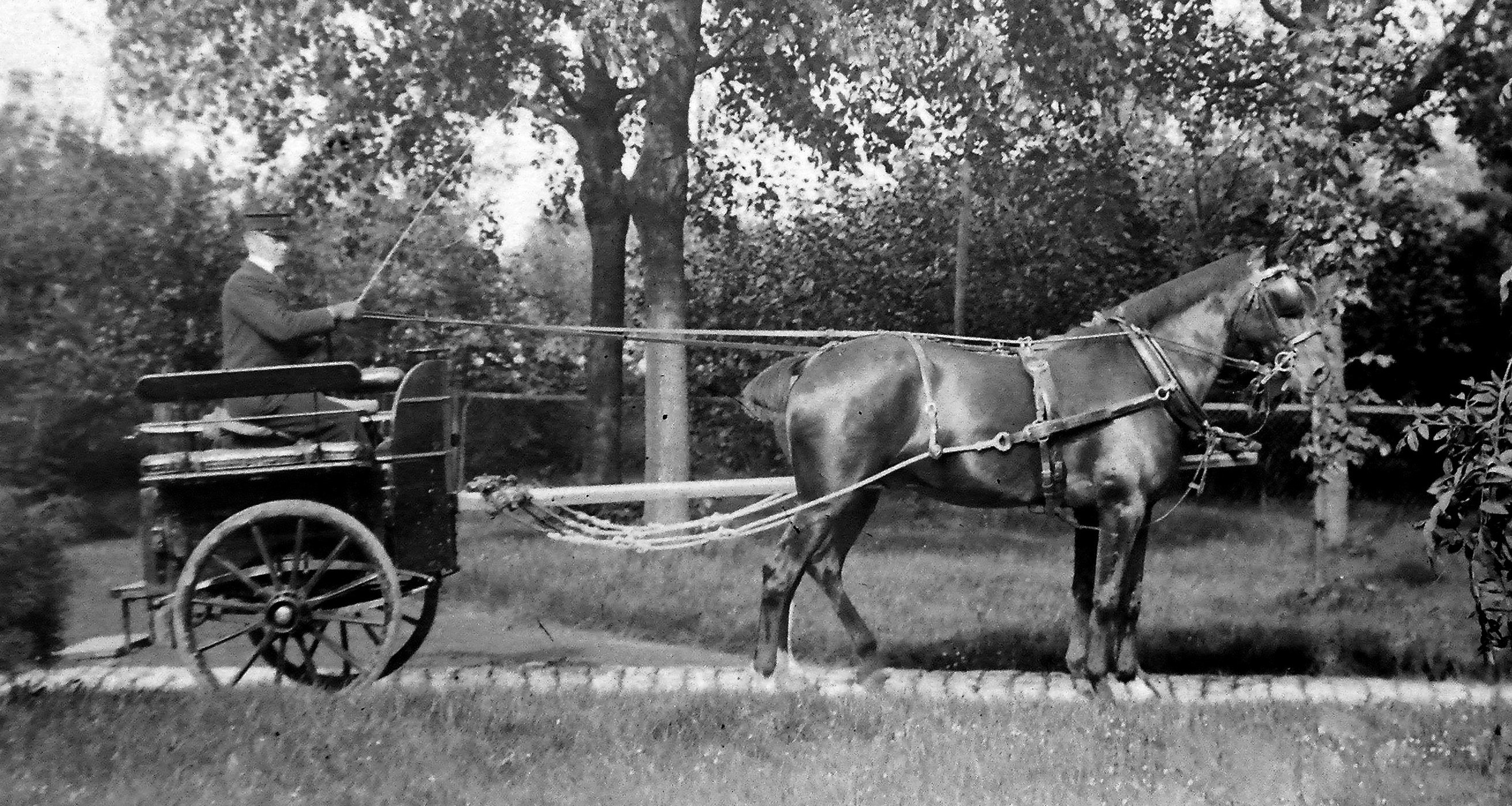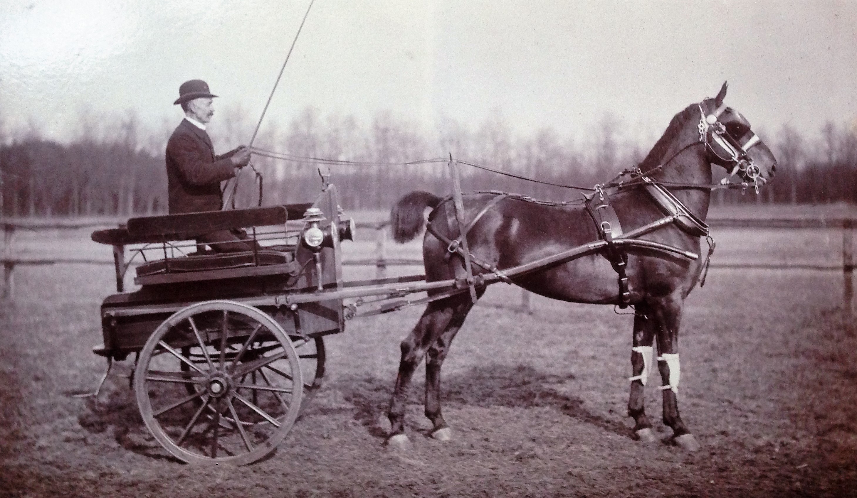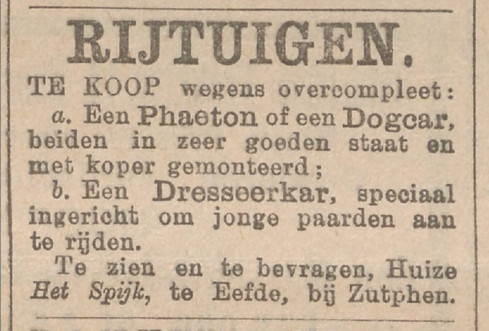 In een luxe herenstal als op Huize Het Spijk in Eefde diende de dresseerkar nog waar hij oorspronkelijk voor is bedoeld: voor het africhten van koetspaarden. Nieuws van den Dag, 8 februari 1899.