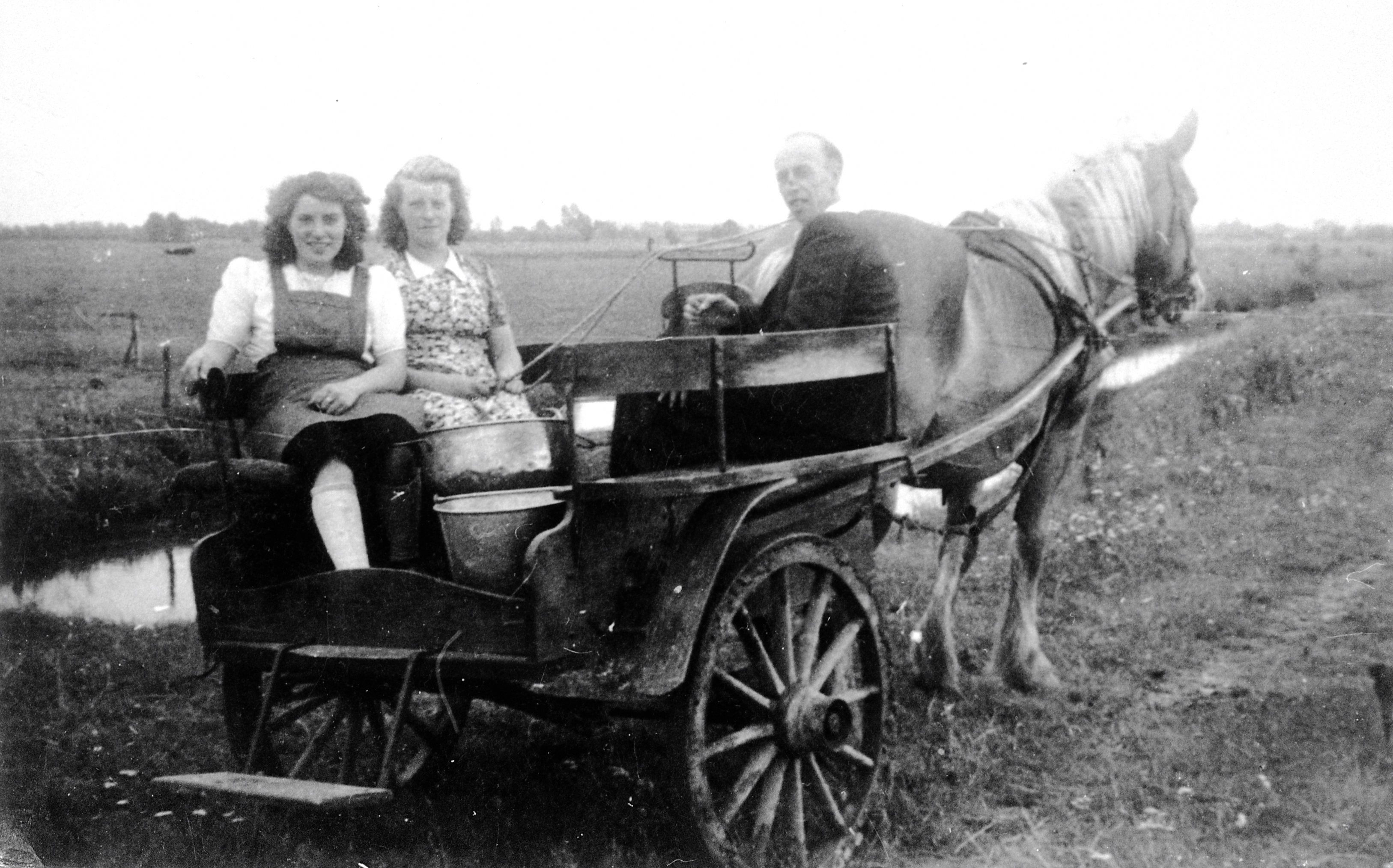 Dresseerkar van de familie Van Dijk uit de Schaijksestraat in Reek in gebruik als melkkar. In de kar Marie (links) en Diena van Dijk. Bij het paard Willy Cornelissen; het bezoek van deze jonge knaap uit Limburg is aanleiding een foto te maken. Foto Ton Cruijsen