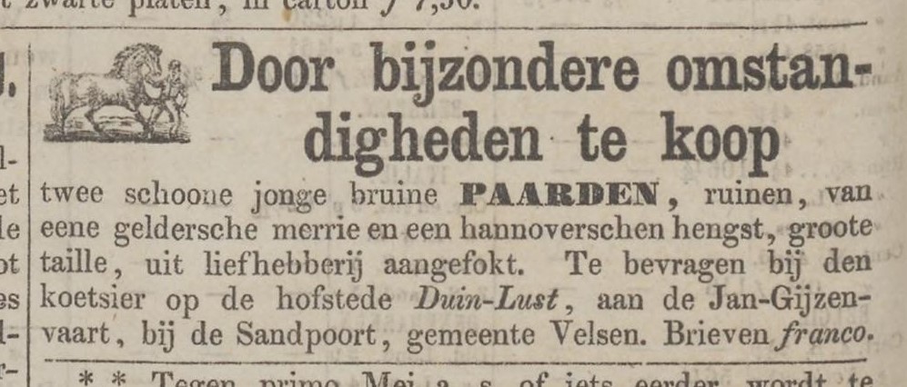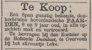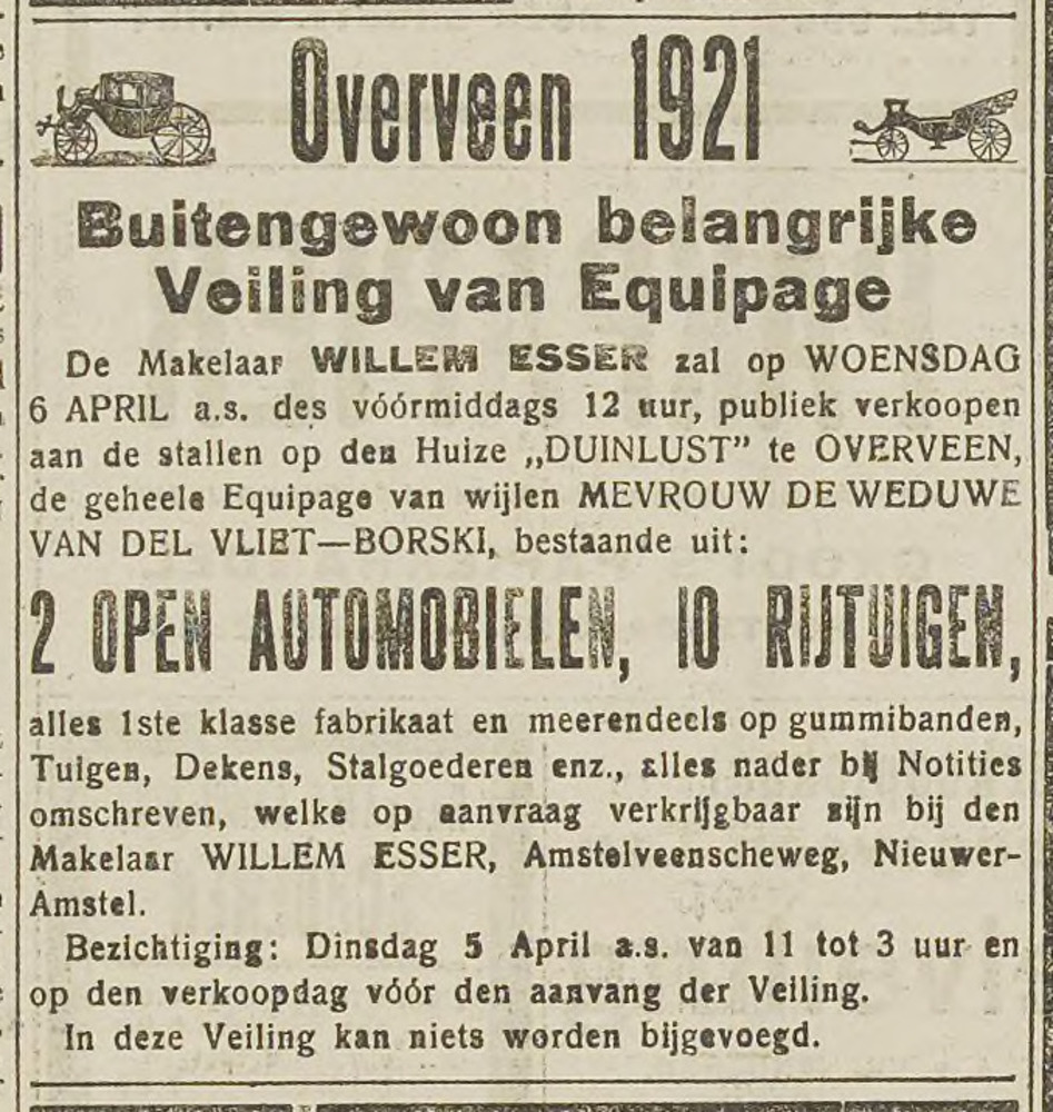 Toen de auto steeds meer veld won, werd besloten de équipage af te schaffen. Op 6 april 1921 kwam daarmee de laatste grote herenstal in de gemeente Bloemendaal onder de hamer. Rijtuigen die bij aanschaf in de 19e eeuw vaak duizenden guldens hadden gekost, gingen voor enkele tientallen guldens van de hand. Een der grote ‘Berlijnen’ met witte zijde gecapitonneerd, haalde juist een rijksdaalder en zou jaren daarna nog doelloos voor een groentewinkeltje aan het Zandvoorterpad te Overveen staan tot weer en wind hun werk hadden verricht.