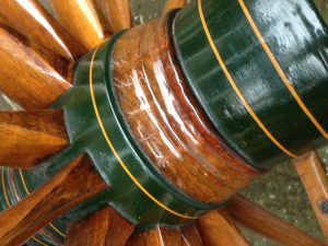 Dat veel rijtuigliefhebbers tegenwoordig denken dat donkergroen vroeger wel de meest gebruikte rijtuigkleur was is het gevolg van iets totaal anders: vernis kleurt onder invloed van vuil en zonlicht donkergroen. Met zo’n laagje bedekt gaat het er op lijken dat ook de meest frisse, vrolijk gekleurde rijtuigen in de loop der tijd sombertjes donkergroen zijn uitgeslagen.