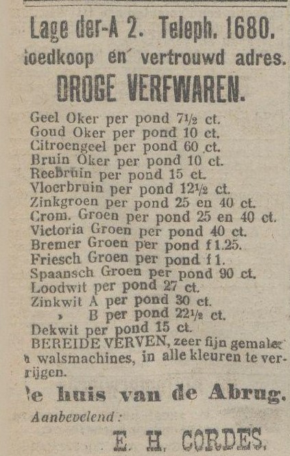 Een rijtuigschilder bestelde de ‘droge verfwaren’ om met standolie te mengen tot natte verf. De variatie aan pigmenten was enorm.