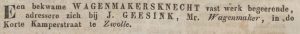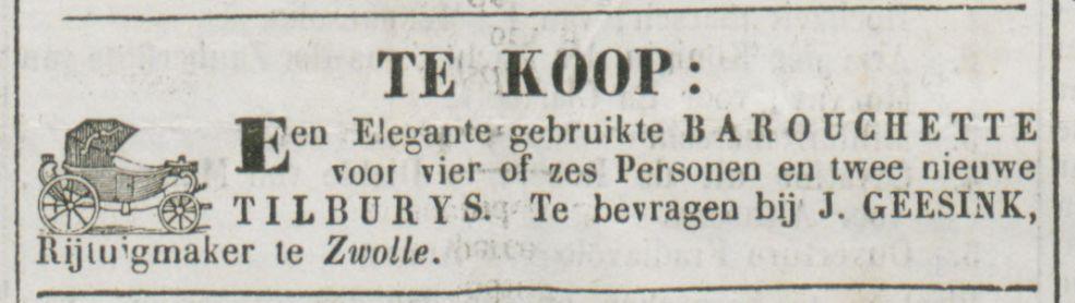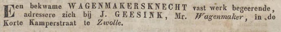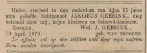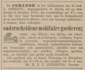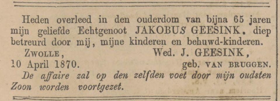Jakobus Geesink (1805-1870) is meesterwagenmaker aan de Kamperpoort in Zwolle. En na zijn overlijden is het de bedoeling dat zijn oudste zoon Jacobus junior, roepnaam Koos, de wagenmakerij overneemt. Maar bepaald gelukkig is die opvolging niet, want al na een half jaar gaat de wagenmakerij, die nog op naam van de weduwe staat, failliet. Het is blijkbaar een flinke last die de 57-jarige Mecheltje van Bruggen voor haar kiezen krijgt, want twee jaar later is de schuld nog niet vereffend en gaat ze opnieuw failliet, waarbij ze haar huis aan de Kamperstraat kwijtraakt. Het is de vraag of Koos al wel ervaring genoeg had om zijn moeder te helpen.