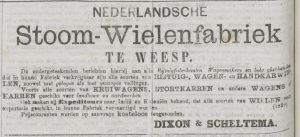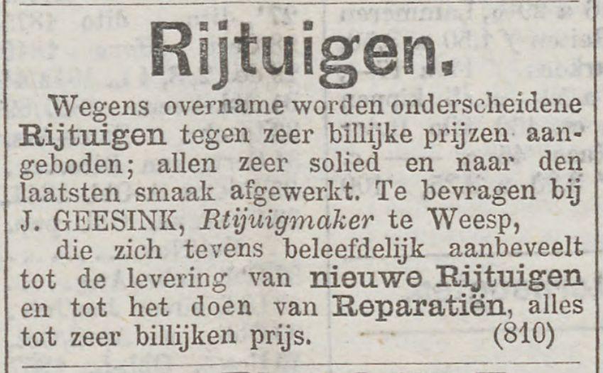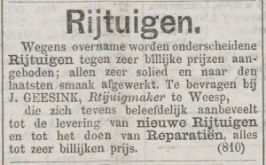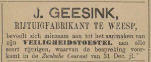 In december 1885 haalt dit aardige bericht meerdere kranten: “Volgens eene mededeeling, onlangs in onderscheidene buitenlandsche bladen voorkomende, zou een rijtuigmaker te Meldorf het middel gevonden hebben om hij het op hol gaan van de aangespannen paarden het leven van hen, die in het rijtuig zitten, buiten gevaar te brengen. Door slechts even roet den voet op een veer te drukken, zou men het voertuig geheel los van de paarden maken. In het belang onzer Nederlandsche industrie vestigt men er de aandacht op, dat deze vinding reeds vóór vier jaren hier te lande is gedaan, en wel door den rijtuigfabrikant J. Geesink te Weesp, bij wie rijtuigen te bezichtigen zijn, waarbij volgens gelijk systeem tegen ongelukken wordt gewaakt. De rijtuigen, gemaakt volgens Geesink’s stelsel, zijn zoo ingericht, dat met het losmaken der paarden het rijtuig zonder schok in rechte lijn blijft voortgaan, tot de beweegkracht is uitgeput. Het gevaar, door eventueel slingeren ontstaande, wordt daardoor voorkomen.” Succes heeft altijd meerdere vaders. In ieder geval brengt Koos zijn uitvinding pas na het verschijnen van dit krantenbericht actief op de markt. En curieus is dat hij er ook mee adverteert in zijn geboorteplaats, in de Zwolsche Courant, waar zijn moeder, broer en zussen nog woonden. Is het een signaal om te laten zien dat het deze Geesink goed gaat? Koos blijft evenwel uitvinden, want later in 1886 zijn het ‘rails-wielbanden’ die hij om rijtuigwielen kan leggen, plat rubber dat in tegenstelling tot rond rubber niet in de tramrails beklemd kan raken. De rijtuigfabriek loopt op stoom en met enige regelmaat is er een grotere stoomketel nodig om de groei van het machinepark bij te benen.
