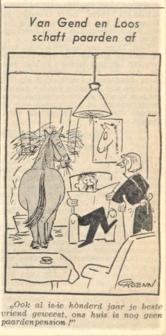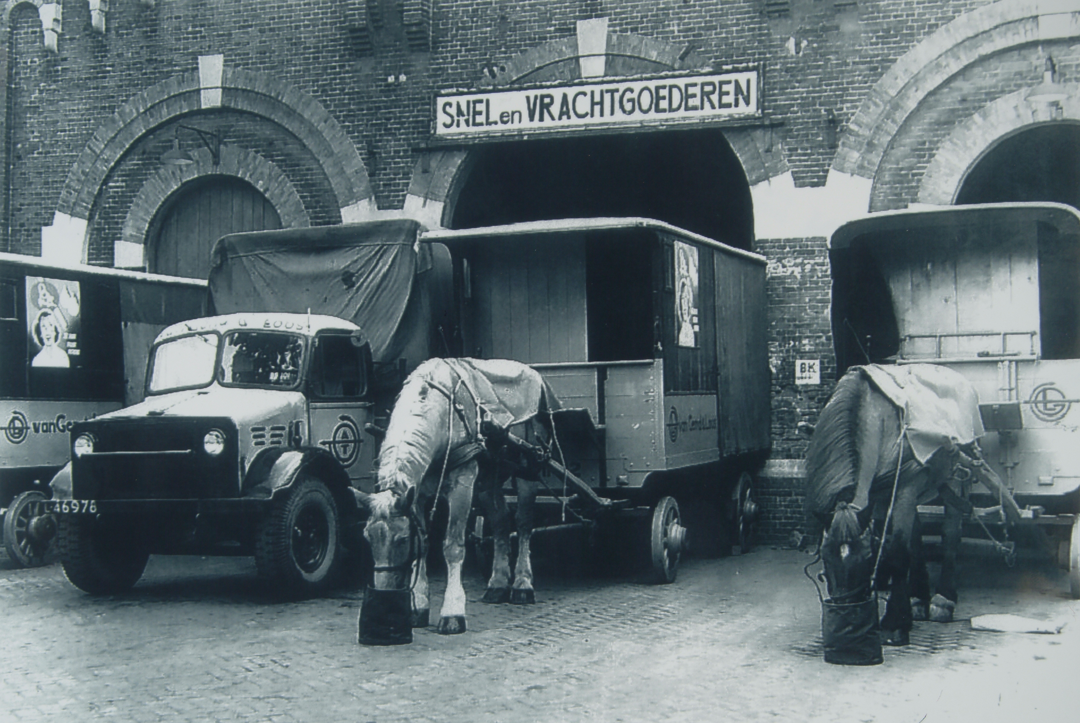 Om het paard, dat zich zo nuttig maakt voor de mens, met een ‘Dag van het Paard’ in het zonnetje te zetten klopt de Dierenbescherming in 1953 aan bij Van Gend & Loos in Utrecht. De firma die dan nog vijfhonderd paarden telt, werkt er graag aan mee. Toch is dat aantal in rap tempo aan het teruglopen, geeft Het Vrije Volk aan dat een kijkje neemt aan de Rotterdamse Jakob Loisstraat waar het weliswaar nog ‘naar paarden ruikt’, maar in drie jaar tijd is teruggeschakeld van 68 naar 26 paarden. De voerlieden maken zich zorgen, maar op het hoofdkantoor krijgt de journalist te horen dat “De NV aan een landelijke afschaffing van paardentractie beslist niet denkt.” De Leeuwarder Courant krijgt het nog eens bevestigd door de bedrijfsjurist en een directielid. De heren rekenen voor dat de vijf kilo geplette haver per dag nog altijd een stuk goedkoper is dan de benzine om een auto telkens te starten. Een grotere zorg voor hen is het personeel: geen van de koetsiers en stalbazen is beneden de veertig, en de jongeren willen op de auto’s. De helft van het stadsvervoer in Amsterdam gaat dan nog met paarden, waarvan er 38 aan de Van Musschenbroekstraat en 60 aan de Westerdokstraat staan. Dat is ondertussen tegen de zin van de gemeenteraad, die dit ouderwetse gedoe niet langer in de moderne binnenstad vindt passen en werkt aan een politieverordening die de paarden moet gaan bannen. Zo ver komt het niet, hoeft het ook niet te komen, want op 12 januari 1957 verschijnt in zo’n beetje alle kranten een klein bericht met ‘Van Gend & Loos gaat paarden afdanken’, over het feit dat in Maastricht de stallen twee weken later leeg zullen zijn. De koetsiers zijn dan omgeschoold tot chauffeur en voor hen staan er vijftien vrachtauto’s van anderhalve ton klaar. Na Maastricht volgen de andere steden en binnen twee à drie jaar zijn de paarden geheel vervangen, is het plan. Dat slaat landelijk in als een bom.