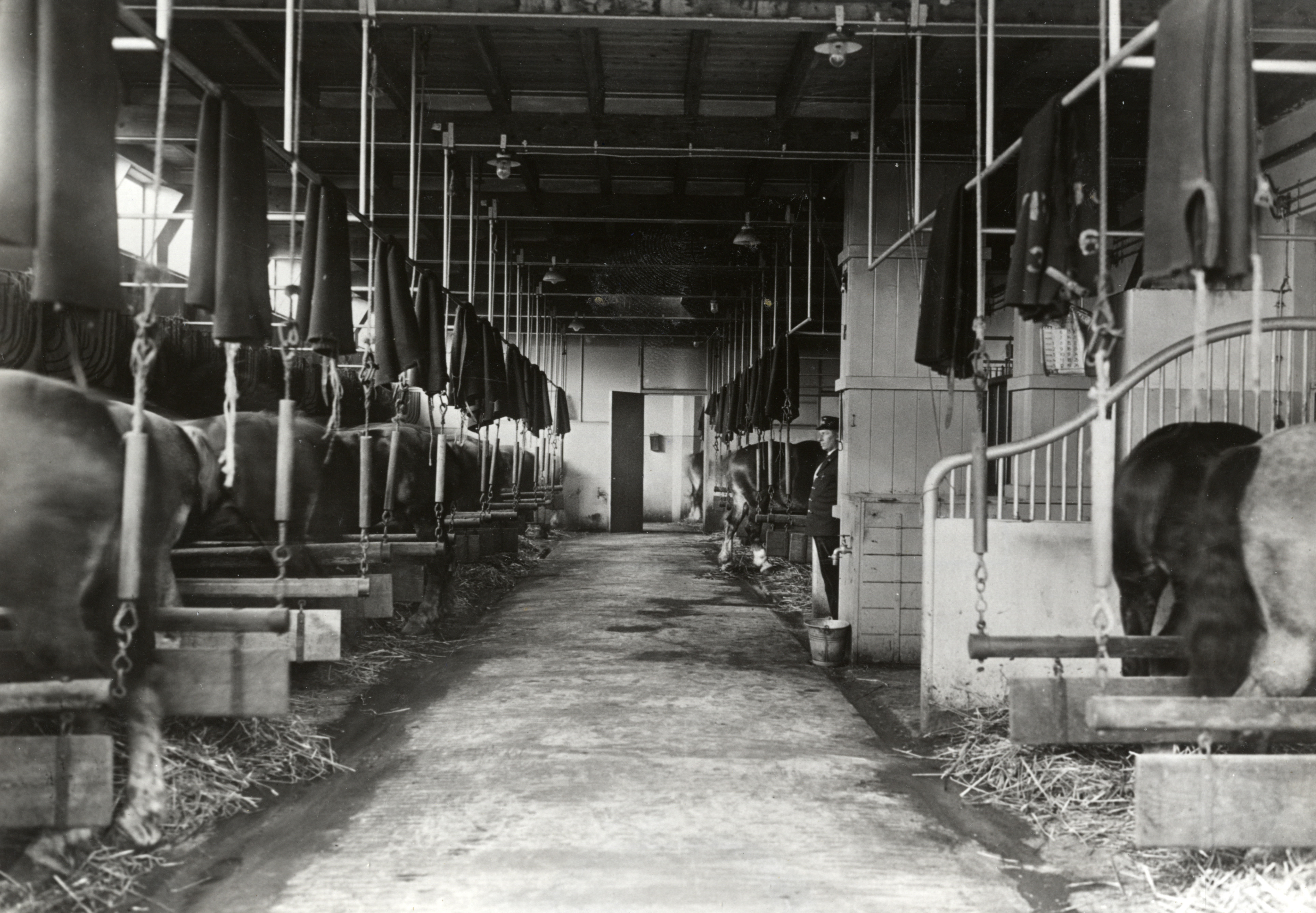 1928, Interieur van de paardenstal van Van Gend & Loos aan de Van Musschenbroekstraat, bij het station Weesperpoort, te Amsterdam. (foto Gemeentearchief Amsterdam)