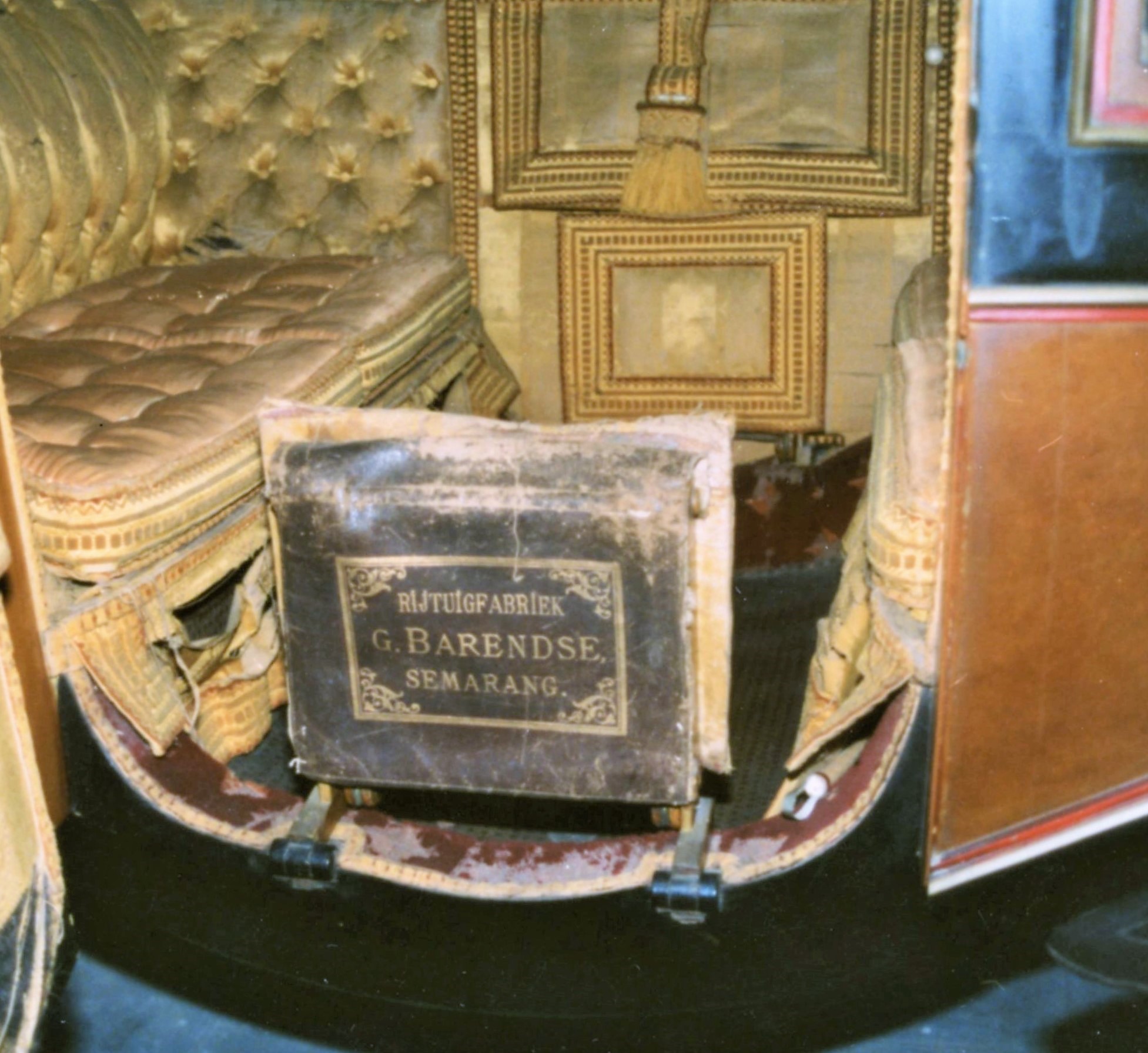 De Nederlandse rijtuigfabricage strekte zich uit tot in Nederlands Indië. En het is juist daar dat bijvoorbeeld op Java nog karossen uit de eerste helft van de 18e eeuw bewaard zijn gebleven, in tegenstelling tot in Nederland waar tijdens de Franse overheersing dit deel van ons erfgoed verloren is gegaan. Ons erfgoed ver weg. Vanuit Nederland werden rijtuigen verscheept in die richting, maar ook op Java waren Nederlanders bezig met het maken van rijtuigen. De bekendste was Gerrit Barendse in Semarang, op het midden van het eiland. De vroegere directeur van het Nationaal Rijtuigmuseum drs. Herman Vos is in zijn boek ‘Kratonkoetsen op Java’ met de opmerking ‘waarschijnlijk alleen de bekleding’ nog voorzichtig met het toeschrijven van rijtuigen aan Barendse. Maar die voorzichtigheid mag overboord.