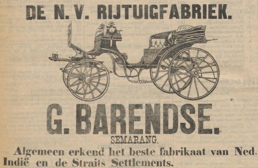 Gerrit Barendse begint op zijn beurt in 1877 een hoefsmederij annex wagenmakerij in Semarang. Vanuit zijn zaak kijkt hij uit op de Centrale Gevangenis en de ingang van de rijtuigfabriek van Racine. Hoefbeslag kost bij Gerrit normaliter één gulden per hoef, het beslaan van Sydney, Swanriver en Preanger is een kwartje per voet duurder. Die laatste drie waren namelijk een slag groter dan de andere inlandse paardjes. En hij repareert dus rijtuigen. Als overbuurman Racine drie jaar later overlijdt, in 1880, is Gerrit zijn ‘successeur’ van diens rijtuigfabriek. Het woord ‘rijtuigfabriek’ klinkt beter dan het is: vooral een soort winkel-van-sinkel met verlaktleer, imitatieleer, Marokkoleer, essenhout uit Europa, veren voor rijtuigen, beslag voor tuigen en rijtuigen, wielen van hickory, essen of djati, hoefnagels en koetsiershoeden. Een meubel laten bekleden kan er ook en ‘ijzeren ledikanten en bultzakken worden op bestelling tegen Soerabaja-prijzen aangenomen’.