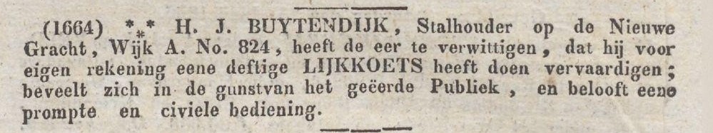 Dit verhaal begint met een flinke stap terug in de tijd. Hendrik Johannes Buytendijk (1795-1846) treedt in 1819 in Utrecht het huwelijk met schippersdochter Hilligje Ebink. Volgens de huwelijksakte is hij dan koetsier van beroep. Toch kiest hij als kersverse echtgenoot in aanvang een ander vak, want als ze zich vestigen aan de Nieuwe Gracht op de hoek van de Groenestraat, is Hendrik daar van 1819-1824 winkelier en kroeghouder. Buytendijk schenkt zijn klanten graag een borreltje. In het tweede kwartaal van 1825 komt daar het ‘verhuur van rijtuigen’ bij en daarmee is de geboorte van de stalhouderij een feit. In de Utrechtsche Courant van juni 1836 heeft Buytendijk: “de eer te verwittigen, dat hij voor eigen rekening eene deftige lijkkoets heeft doen vervaardigen; beveelt zich in de gunst van het geëerde publiek, en belooft eene prompte en civiele bediening.” Later dat jaar verhuist de stalhouderij naar de Nieuwe Gracht 129.
