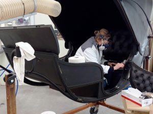 foto boven: de restaurator bezig met het leer van de kap: eerste reinigen, daarna 3x ‘voeden’.