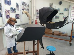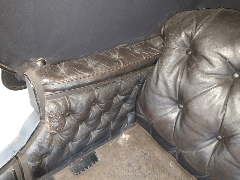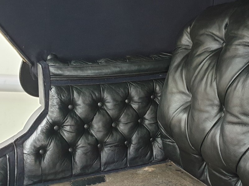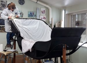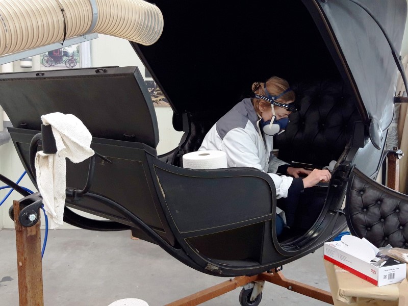 “Om alle beschadigen heen is eerst de lak op de body geconsolideerd, voordat we verder ook maar iets aanraken. Dan begin je met werken van boven naar beneden en van binnen naar buiten. Eerst dus de kap en dan de stoffering enzovoorts”, geeft Maria Stolk als toelichting. De leren kap van de wagen oogde wat sleets. Vouwschade, noemt Maria dat, om er op te wijzen dat er geen scheuren in zitten en daarmee nog prima in orde. Het juiste poetsmiddel deed in dit geval wonderen. Maar domweg invetten is niet altijd wijs, zo is te zien op de bekleding aan de binnenzijde. De restaurator kruipt in het rijtuig, met een lampje op haar voorhoofd om aan te wijzen wat ze schoon heeft gemaakt: “Er zat een dikke laag zwart ledervet op de saffiaanleren stoffering, ooit aangebracht om de slijtageplekken te camoufleren. Dit rijtuig is dus best veel gebruikt, te zien aan de slijtage van de bekleding. En zoals je ziet zijn er vlekken van dit zwarte ledervet in de hemelstof van de kap gekomen en was het passement ook mee ingevet.” Samengevat: het was een beetje smerige boel van binnen. Inmiddels is het weer aardig schoon. Maria heeft geen kritiek op degene die het rijtuig in de afgelopen decennia heeft verzorgd. Ze prijst eerder de uitvinding van het simpele hoofdlampje: “Het is zonder zo’n lamp op je hoofd zo donker onder een kap, dat je de hemel en het passement ook insmeert, zonder dat je er erg in hebt.”