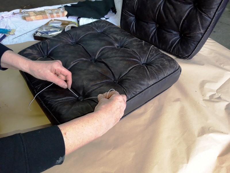De ‘nepknopen’ die ooit in de kussens zijn getrokken, zijn vervangen door de juiste met saffiaan bekleed.
