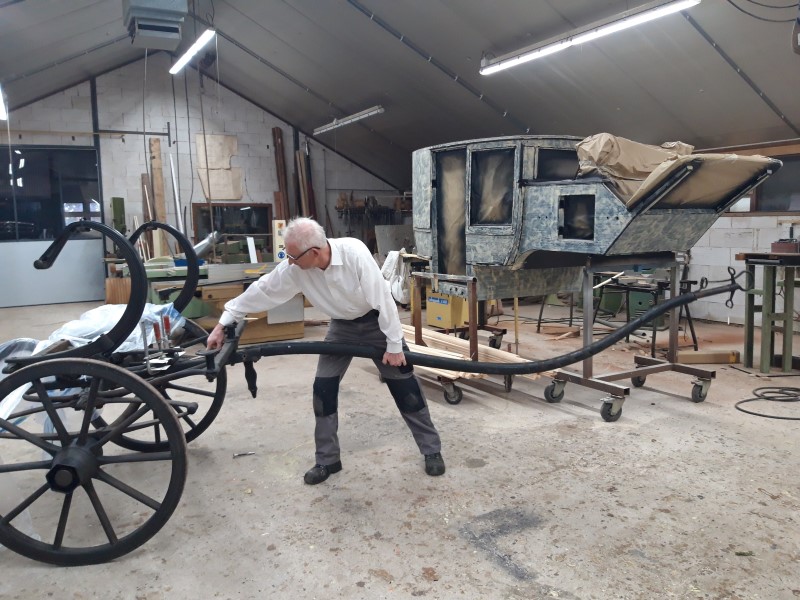 Een tegenvaller, die tegelijkertijd aantoont hoe nodig de restauratie is, kwam bij het optillen van de bak. De leren riemen waarin het rijtuig hangt, waren bijna doorgesleten en stonden op knappen. Als dat gebeurt is de schade enorm. Maar gelukkig. In de post ‘onvoorziene kosten’ zijn nu vier nieuwe riemen opgenomen, net zoals we nog wachten op nieuwe riemen voor de Grand Duc. Uiteraard worden al die dikke riemen in één keer gemaakt. Wie zulke riemen nog met de hand stikt? Daarvoor is de oude zadelmaker Kees Groeneveld gevonden, een ambachtsman die al vanaf 1959 op het Zuiderdiep te Groningen in ‘leder- en touwwerken’ doet. Authentieker kan het niet.