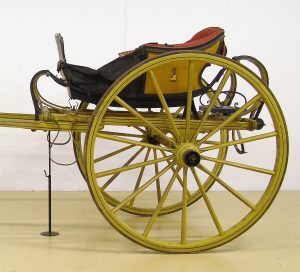 Zo precies als de heraldische regels zijn en zo precies als de omschrijving van een familiewapen is, zo vrij is de uitvoering. Ambachtslieden en kunstenaars mogen een eigen stijl toepassen en zwierige details toevoegen, zolang het geschilderde of gebeeldhouwde wapen maar kan worden geïdentificeerd. Die vrijheid heeft als gevolg dat we het familiewapen ‘Bisdom van Vliet’ in heel verschillende uitvoeringen tegenkomen. Op de zijpanelen van de cabriolet zijn de wapens een beetje sober geschilderd, met bovenop een middeleeuwse helm met wrong, en een steigerend paard als helmteken. Afgezien van een dominante slagschaduw zijn er geen extra versieringen aangebracht. Het wapen is bescheiden, want de cabriolet was een informeel rijtuig, maar voorbijgangers konden wel direct herkennen bij welke familie het hoorde. En daar ging het om. De Bisdommen waren trots op hun af komst en lieten dat graag zien.”