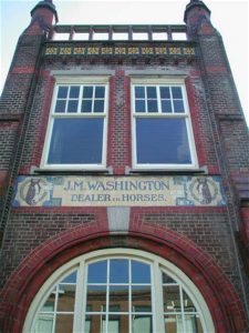 De naam ‘JM Washington Dealer in Horses’ is blijven staan op de gevel van het gebouw aan de Theresiastraat in Den Haag, al is het rijksmonument ironische genoeg heropend als sport- en fitnessruimte.
