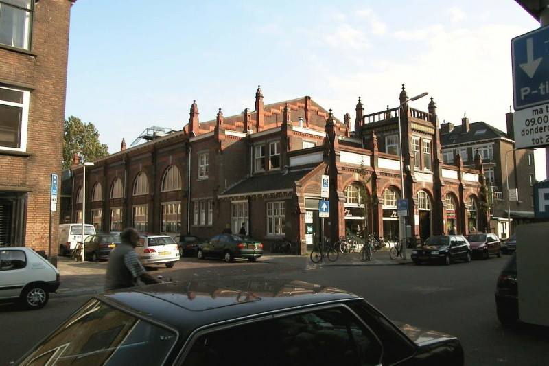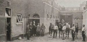 Van hier leidt een breede gang naar de andere stallen, waar de manége- en andere paarden hun tehuis hebben. In ’t geheel zijn er 40 paarden, waarvan 13 manegepaarden en 4 concourstuigpaarden. Een zeer mooie, geriefelijk ingerichte ziekenstal is er, waar de paaiden die onder behandeling van den veearts zijn, worden gestald. Hier is ook een stroomend bad, voor paarden, die baden moeten gebruiken. Naast de stallen is een groote monsterplaats en een voer-kook-inrichting. Een haverpletterij is boven de stallen, evenals de hooizolders. Het privékantoor van den heer Washington is eveneens beneden, terwijl bij den ingang de garderobe en het buffet zijn. Van uit de vestibule leidt een breede trap naar de kleedkamers voor heeren en dames en naar de douches. De kleedkamers zijn uiterst geriefelijk, doch eenvoudig ingericht. Verder noodt een kleine hall de bezoekers tot rusten; tijdschriften op het gebied van sport zijn er volop. Boven zijn ook galerijen, vanwaar men een aardig gezicht op de manége heeft. In de loge speelde gister, tusschen groen en planten, een strijkorkest lustige wijsjes. Het inwendige van ’t gebouw is in lichte grijs-gele kleur geverfd, en geeft een helderen, frisschen aanblik. Van buiten is het uit rooden steen opgetrokken. De architecten, de heeren van Ameyden van Duvn en J.J. Gort, hebben eer van hun werk. Bij de opening was er van de zijde van het publiek veel belangstelling.”