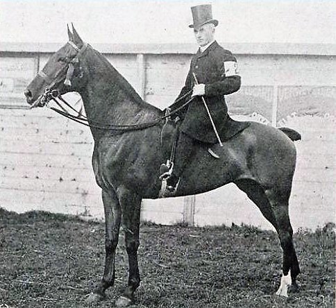 Rechtsboven: Jack M. Washington op het concours te Den Haag, Zorgvliet, 1909, waar hij met The Merry Widow de eerste prijs voor schoonste rijpaard won.