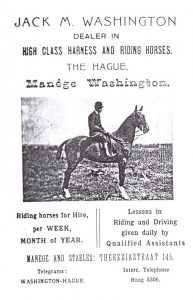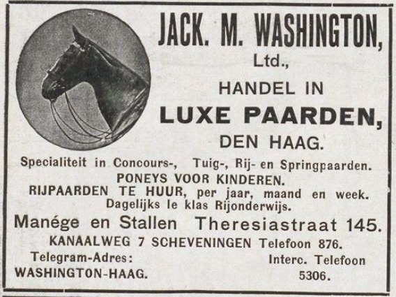 In de Revue der Sporten van juni 1914 maken we nader kennis met het reilen en zeilen van de NV Paardenhandel en manege v/h. J.M. Washington te ‘s-Gravenhage. “Washington! Ziedaar een naam in de hippische wereld. Een goede naam, en dit te danken aan het feit, dat hij wordt gedragen door den importeur van de meeste prijswinnende paarden op onze concours-hippiques, door een op ende top horseman, bekend om zijn voortreflijk voorrijden van la plus noble conquête de l’homme op onze sportfeesten. Het was in 1903, dat de heer Washington voor ’t eerst op een onzer concoursen uitkwam. Hij was tevens de eerste buitenlander, die zich als deelnemend ruiter aan ons publiek presenteerde. De heer Washington won toen — het was in de Maliebaan te ’s Hage — een vierden prijs, met een later zeer bekend geworden paard, dat onder den naam Djompoe den officier Van Gellicum veel succes bezorgde. Kort na dien heeft deze Engelschman aan de Casuaristraat te ’s Hage een paardenhandel geopend, welke naderhand naar Scheveningen resp. naar den Harstenhockweg en Maaswijckstraat verhuisde, en thans wederom in de Hofstad en wel in de Theresiastraat is gevestigd. De zaak is sinds 1 april 1913 een vennootschap geworden. Men kan niet anders zeggen, of de heer Washington heeft in dien tijd met zijn importen veel succes gehad. De meeste prijswinners werden door hem ingevoerd. Wij noemen o.a. Gay Lad, May Queen, Prinses Juliana, Perhaps, Topthorne, Gay Lass, welk fraai exemplaar voor Mr. van Hoboken te Rotterdam meer dan 10.000 frcs. in springnummers wist te winnen, verder Tiddly Winks en Sunny Jim, de vroeger welbekende paarden van Mr. Paul Wurfbain, Galant van Baron van Pallandt, Miss Lind en Jenny Lind, Forest Queen, King of the Earth, Doreen, Challenger, het beroemde paard van den heer Leo v. d. Bergh, Holland Squire, His Majesty enz. Verleden jaar werden door de viervoeters van dezen stal afkomstig, meer dan 100 prijzen gewonnen. Nog te Rotterdam legden voor kort door den heer Washington geïmporteerde tuigpaarden beslag op vier eerste prijzen. Aan de zaak is eveneens een manege verbonden, die vooral den laatsten tijd zeer bloeit. De omstreken van Den Haag eigenen zich bijzonder voor paardrijden, en vooral de aristocratie der Hofstad maakt veelal gebruik van het hier beschreven etablissement. Op 4 mei j.l. heeft nog in de manege een hippisch festijn plaats gevonden, waarbij verschillende dames en heeren, die de inrichting frequenteren, welwillend medewerking verleenden. Summa summarum heeft de paardensport hier te lande veel aan dezen buitenlander te danken. Neemt de inrichting Washington in bloei toe — en alle omstandigheden wijzen hier op — dan kan ’t niet anders, of ook de hippische sport in ’t algemeen zal daar wel bij varen.”