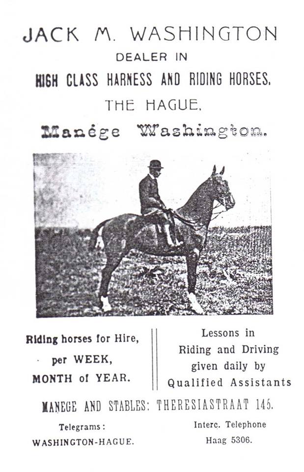 In de jaren tien van de vorige eeuw stonden de paarden van de Engelsman John Mayer Washington (1883-1930) in menig rubriek op de Nederlandse concoursen aan kop: enkelspannen voor landbouwers, jachtpaarden, militaire paarden tot vierspannen voor de coach. Jack, zoals zijn roepnaam was, reed zelf verdienstelijk onder het zadel en aangespannen, maar was vooral een grote paardenhandelaar in Den Haag.