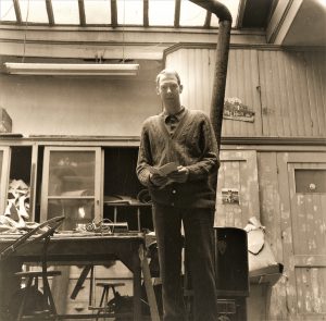 Jan Willem Jonas in de werkplaats, waar de krukjes tot het overlijden van zijn vader bleven staan (foto Martijn Reeser).