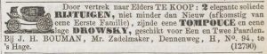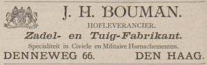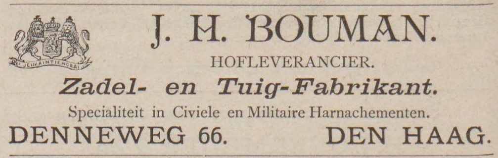 Het verhaal begint met Johannes Henricus Bouman (1800-1875), zoon van een Nijmeegse zadelmaker, die in 1838 trouwt met Johanna Antonia Putters. Hij vestigt zich als zadelmaker aan de Houtweg in Den Haag. In 1844 verhuist het stel naar de Denneweg, waar hij de werkplaats overneemt van Costerman en, net als zijn voorganger, adverteert met rijtuigen te koop. In deze tijd is het nog gewoon dat rijtuigen via een zadelmaker in de verkoop gaan, want dat was de man die de laatste hand aan een rijtuig legt en de klanten heeft. Bouman biedt rijtuigen aan met leuke namen als ‘charretje’, ‘drowsky’ en ‘tompouce’, waarbij we van die laatste geen idee meer hebben, anders dan een gebakje. Een nu onbekend rijtuig dus. Maar tweedehands vigilantes, nieuwe victoria’s en een barouchette verkoopt hij ook. Tegen 1874 laten de Haagse rijtuigfabrikanten zich de kaas niet meer van het brood eten door een zadelmaker, en legt Bouman’s zoon Johannes Hendricus (1845-1916) zich vooral toe op zadels en tuigen als hij de zaak overneemt. Onder hem komen de gloriejaren aan de Denneweg. Zeker twintig ‘koperen en zwarte’ gareel- en borsttuigen zijn er op voorraad. Dat is nodig ook, want niet alleen de stalmeester Bentinck schaft er tuigen aan voor de latere Koningin Wilhelmina, haar moeder Emma en Prins Hendrik, ook tal van adellijke families halen dit fabricaat in huis. Zo komen er bijvoorbeeld op de kastelen Twickel in Delden, en Middachten in De Steeg tuigen van Bouman. Opmerkelijk: Bouman schroomt er niet voor om zijn naam zichtbaar op het tuig -in de zogenaamde kokerpassanten- te drukken. Iets dat een andere hofleverancier niet zou durven, is in dit geval juist een geaccepteerde aanbeveling.